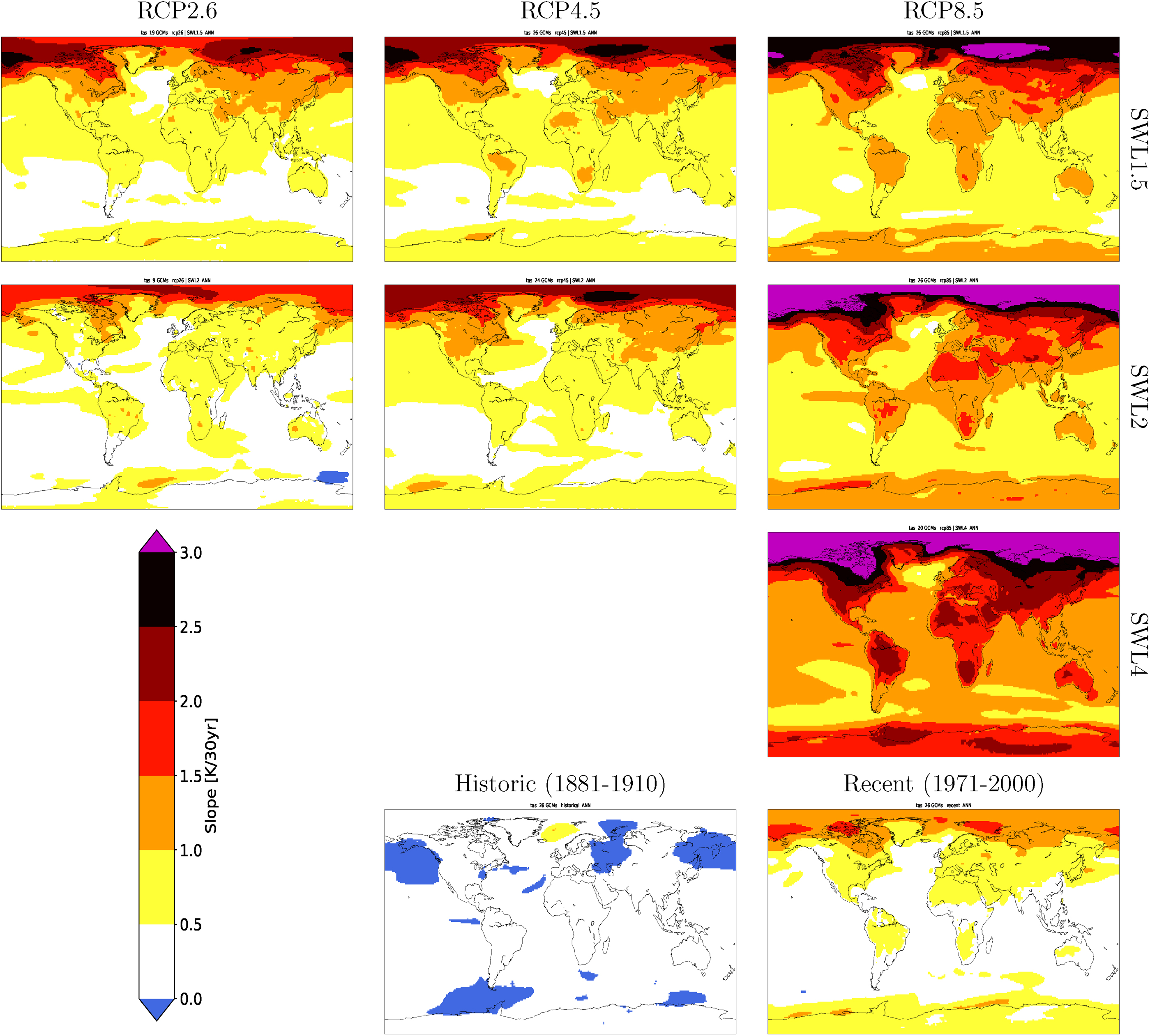 Table 3 summarizes the overall slope in global mean temperature for the historic period (1881−1910), the recent period (1971−2000) and for all combinations of SWLs and RCPs. Figure 2 shows the ensemble slope of temperature in all grid points. In supplementary figure S1 the statistical significance of the slope is shown in the same fashion.