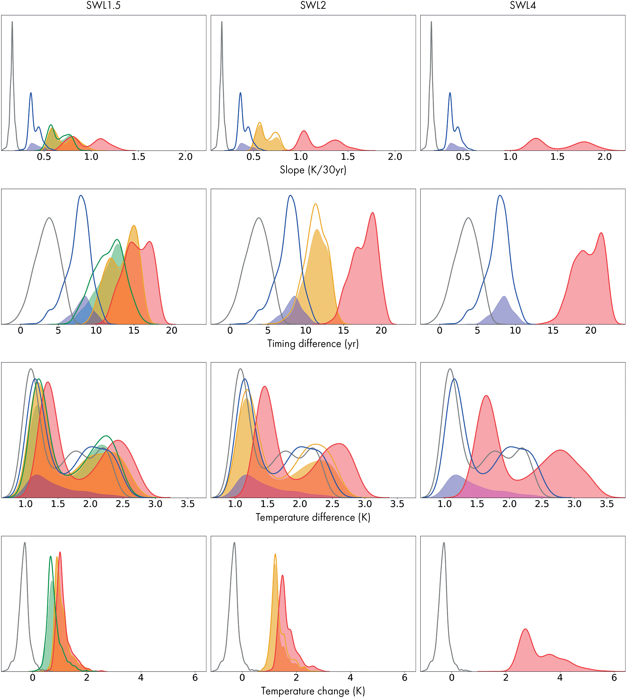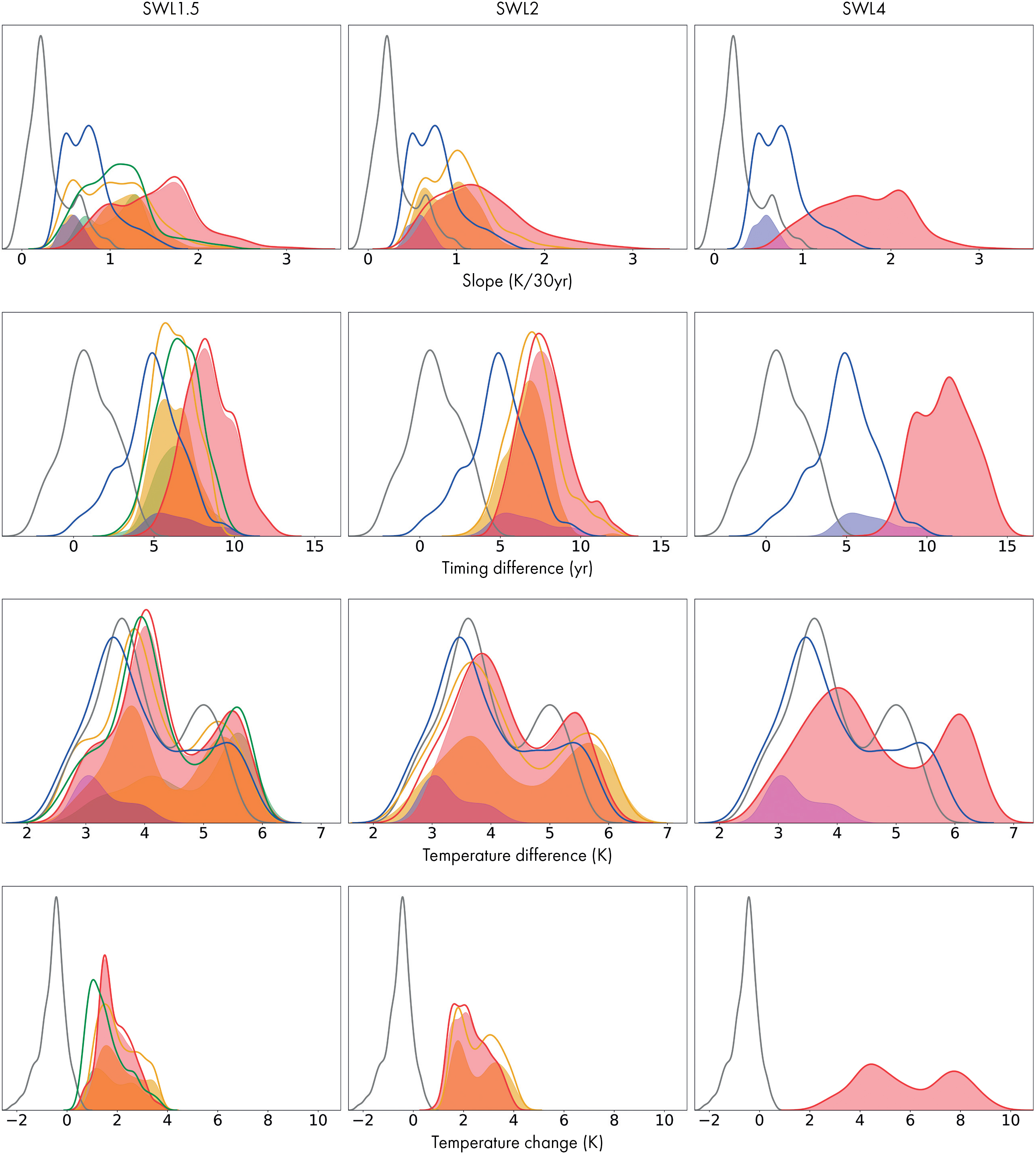 Figure 3. Normalised frequency distributions of the four different metrics for all grid-points in the North Europe ('NEU') region as defined in IPCC AR5 (www.ipcc-data.org/guidelines/pages/ar5_regions.html, accessed 2017-07-05). Top row is the slope (K/30 yr) of the annual mean temperature, second (third) row is the difference in years (temperature (K)) between the three coolest and the three hottest of the annually warmest month. Bottom row shows the temperature change (K) relative the recent period (1971−2000) for the three hottest months. Grey line is the historic period (1881−1910), blue is the recent period, green is RCP2.6, yellow is RCP4.5, and red is RCP8.5. The thin curves represent data for all grid-points and the filled areas represent data for grid-points where the slope p-value < 0.001 (supplementary figure S1).
