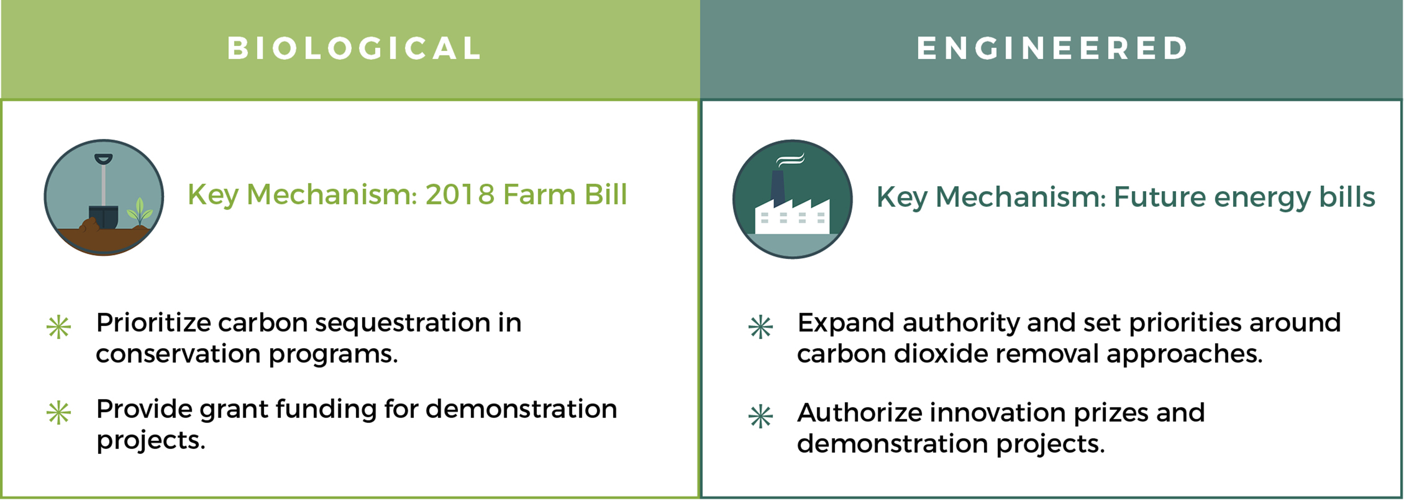 Typically, agriculture and energy policies in the US are set by periodic, omnibus legislation, colloquially known as 'farm bills' or 'energy bills.' Energy bills provide a platform to enhance DOE efforts. For example, two amendments to the 2016 Energy Policy Modernization Act would have supported carbon removal solutions if the bill had become law during the 114th Congress. One amendment sought to expand DOE's authority to award technology prizes to projects that separate CO2 from dilute sources (Barrasso 2016). A second amendment could be designed to support demonstration of net-negative emissions projects (Manchin 2016). This amendment would have named net-negative carbon dioxide emissions projects as a programmatic priority, and authorized five years of funding for BECCS demonstration projects. Both of the amendments sought to expand the existing authority of DOE program offices, and suggest the role that legislative authorization will play in supporting CDR.