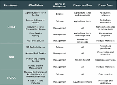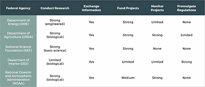 The second barrier is inter-agency collaboration on biological CDR. Notably, agencies have different levels of scientific expertise, ability to promulgate regulations and offer grants, and land ownership, though they work on similar ecosystems. Land-based RD&D programs are more likely to be effective if they are designed to take advantage of the differences between agencies, promote science exchange across the federal government, avoid unnecessarily burdensome inter-agency processes, and advance research on the comprehensive range of ecosystems encompassed by the participating agencies.