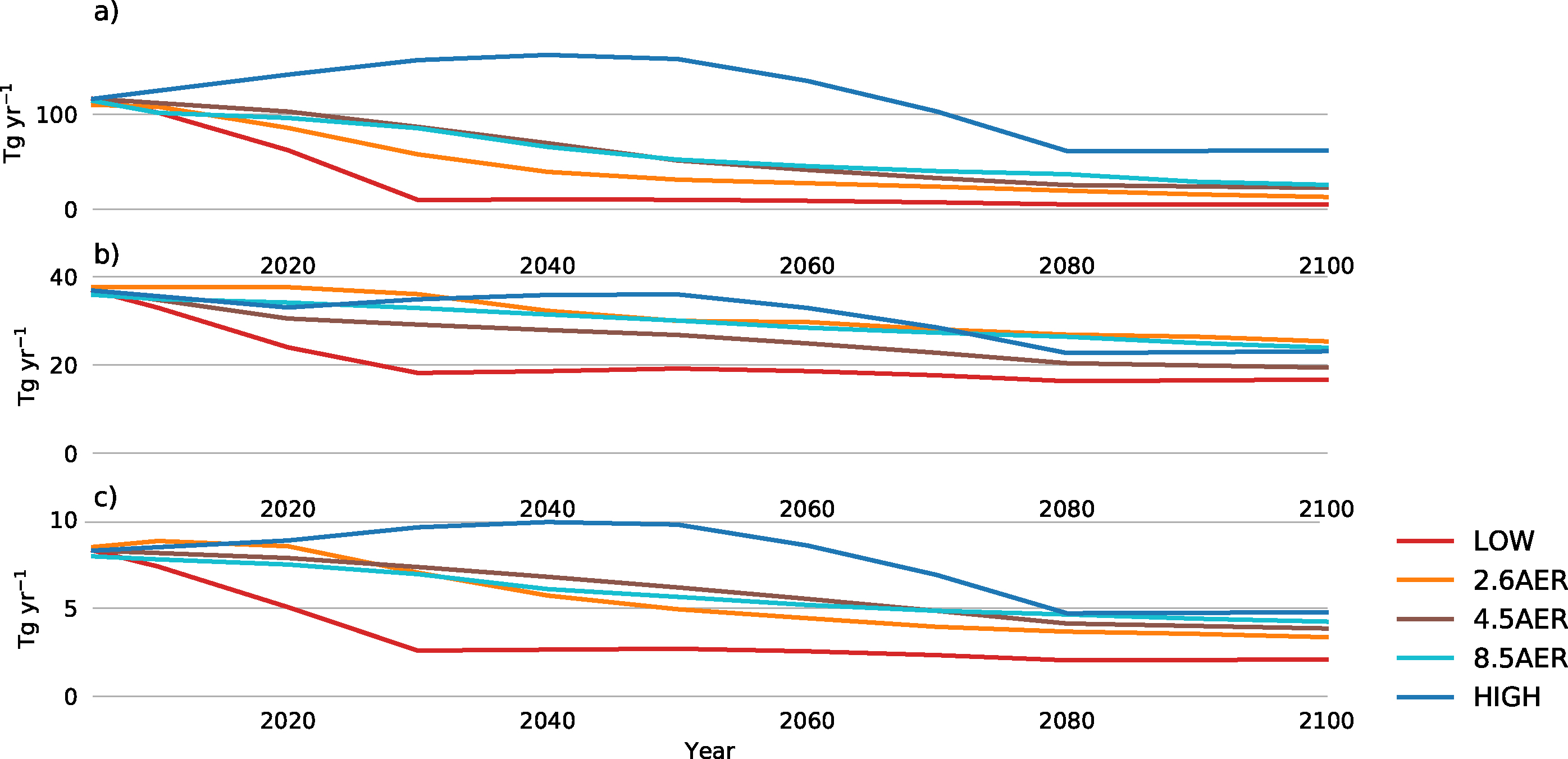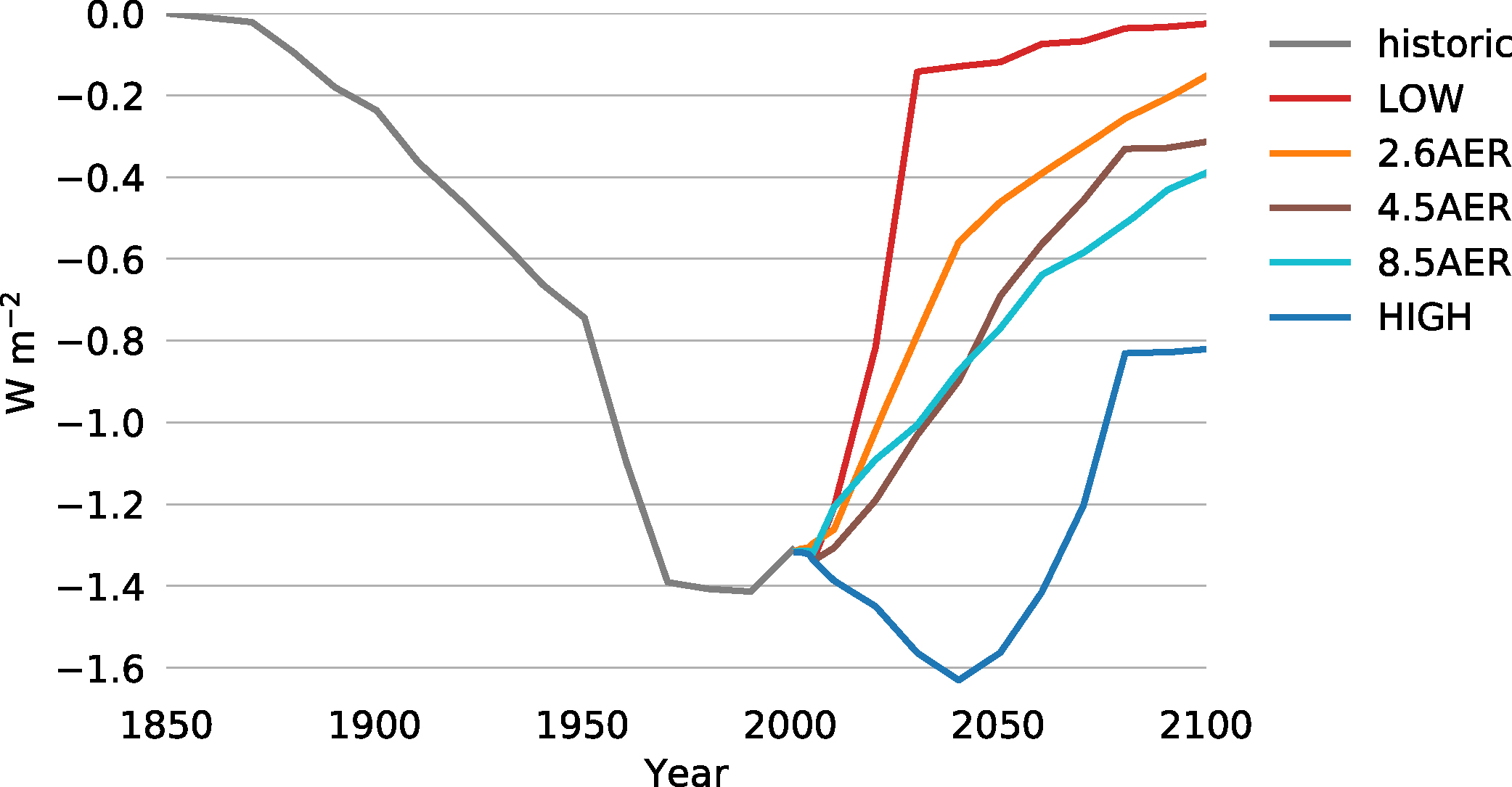 The transient global mean ERF was fairly similar for the three AER simulations. The magnitude of aerosol ERF decreased steadily to between −0.15 W m−2 and −0.39 W m−2 in 2100. The largest difference across the AER simulations was 0.34 W m−2 in 2040. These results are similar to results by Westervelt et al (2015). The differences were much larger for our low- and high-end estimates. In LOW, the magnitude of aerosol ERF decreased quickly and was only −0.14 W m−2 in 2030. The subsequent decline (driven by decreasing global CO2 emissions) was slower, reaching −0.02 W m−2 by 2100. In HIGH, on the other hand, the magnitude of aerosol ERF continued to increase until 2040 due to the increase of CO2 emissions, reaching a peak value of −1.63 W m−2. After 2040, the magnitude of aerosol ERF started to decline but it was still −0.82 W m−2 in 2100.