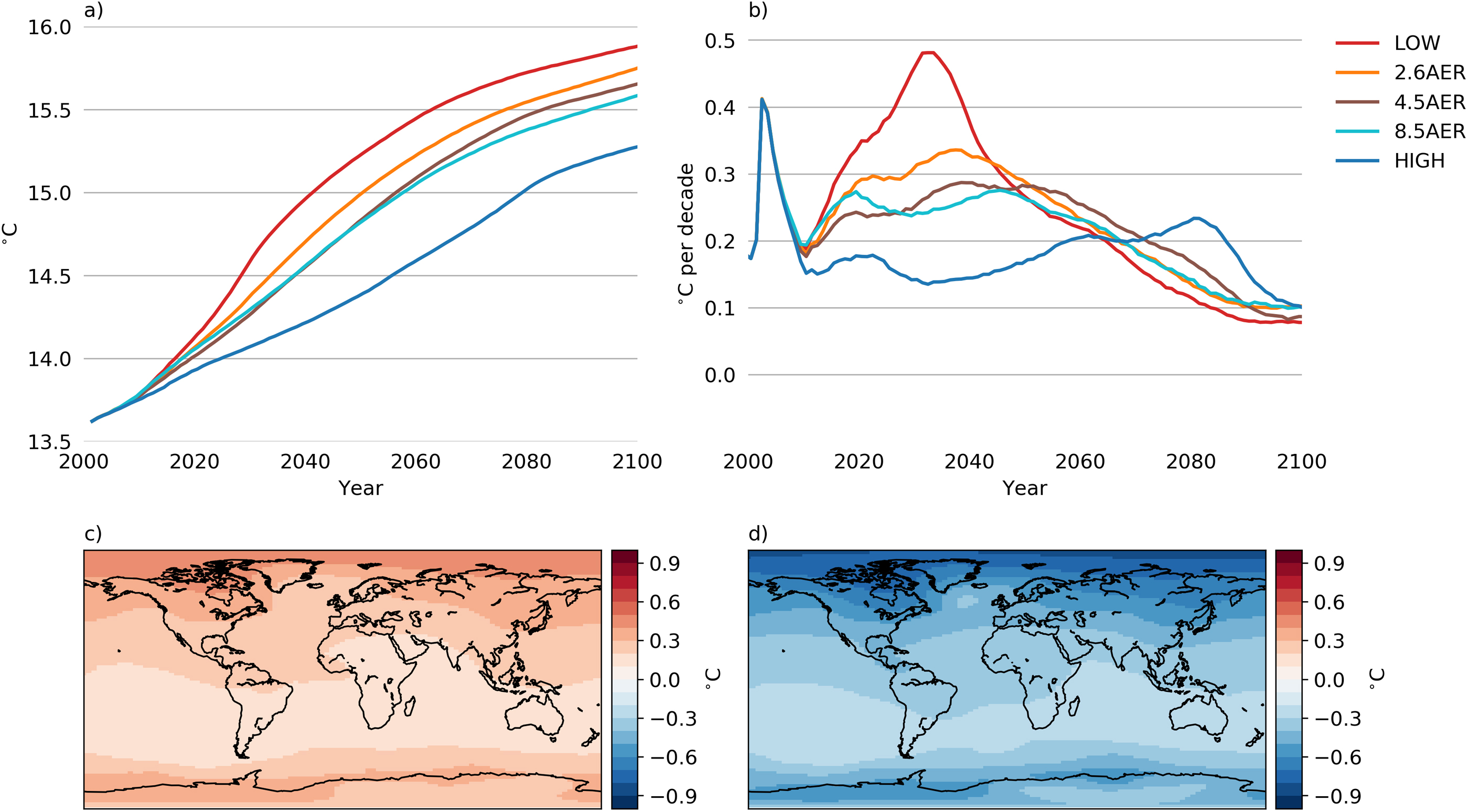 Figure 3. Global (a) annual mean surface air temperature and (b) 10-year running mean warming rate for the different aerosol scenarios, and spatial differences in mean surface air temperature for 2090–2100 between (c) LOW and 4.5AER and (d) HIGH and 4.5AER. All non-aerosol forcings in the UVic ESCM followed RCP4.5.