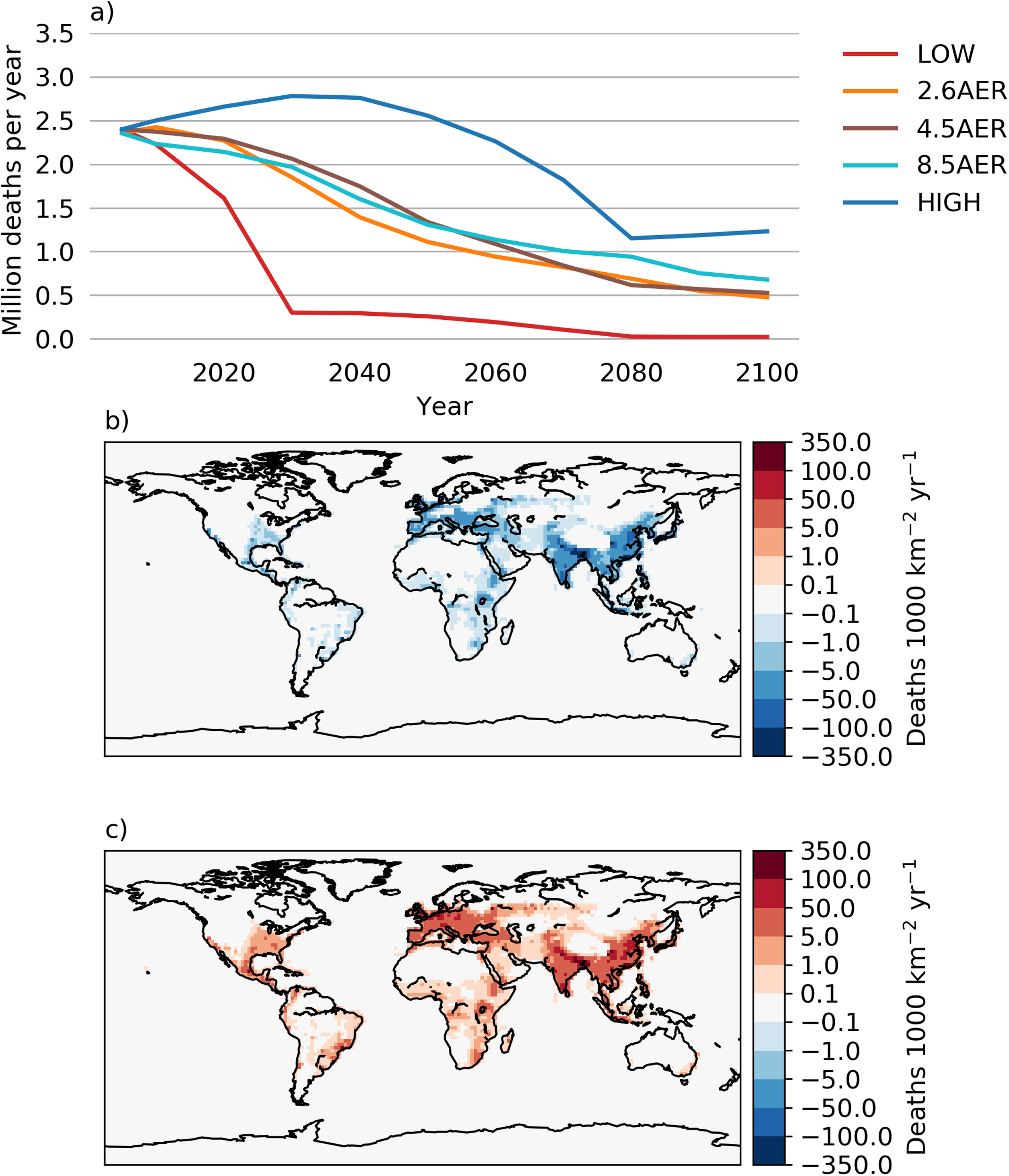 Standard image High-resolution imageFigure 4. (a) Global total annual premature mortality due to PM2.5 using year-1850 aerosol emissions without anthropogenic contribution as the reference, and spatial differences in annual premature mortality due to PM2.5 in 2100 between (b) LOW and 4.5AER and (c) HIGH and 4.5AER. Changes in mortality were due to changes in PM2.5 alone, as we used present-day population and baseline mortality rates throughout.