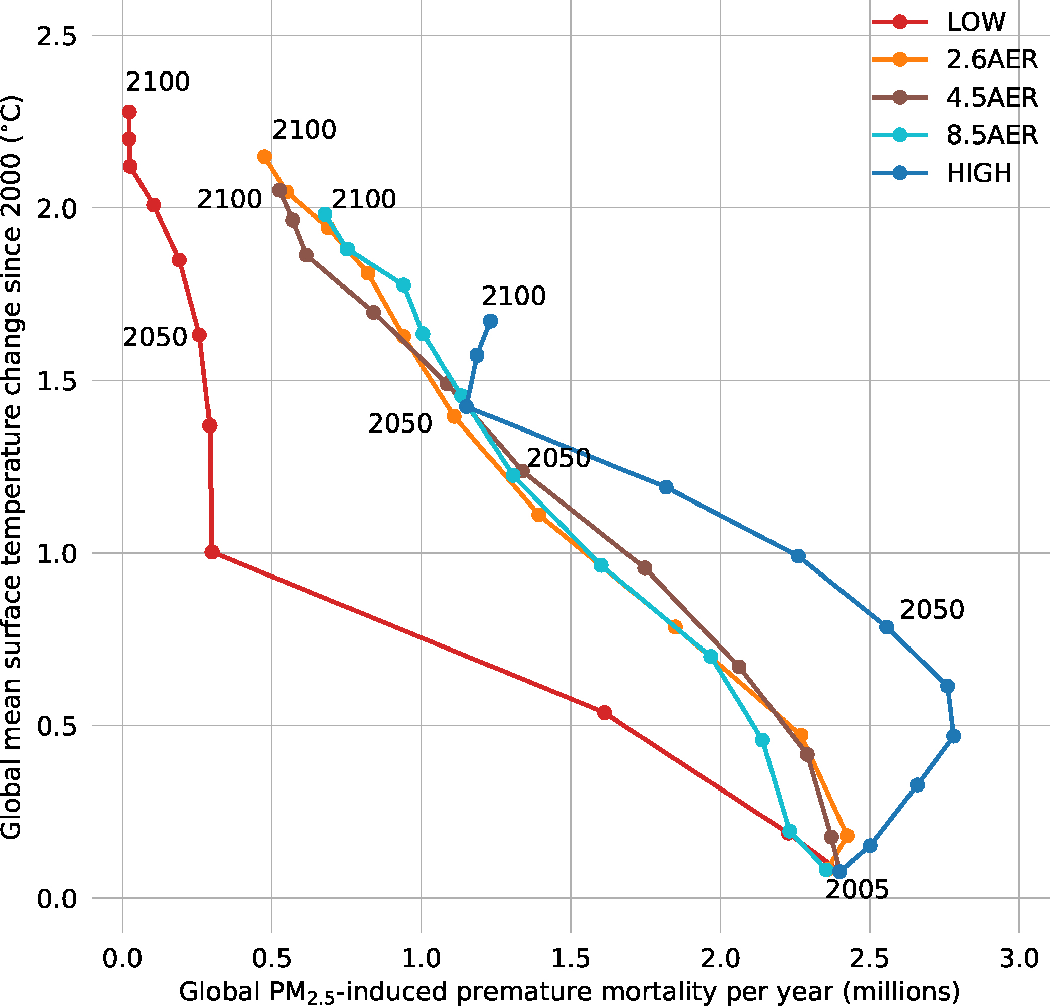 Figure 5. Time evolution of the global mean temperature change relative to year 2000 and the annual PM2.5-induced premature global mortality. The beginning of each simulation is in the lower right corner and each point corresponds to a 10 year time step.