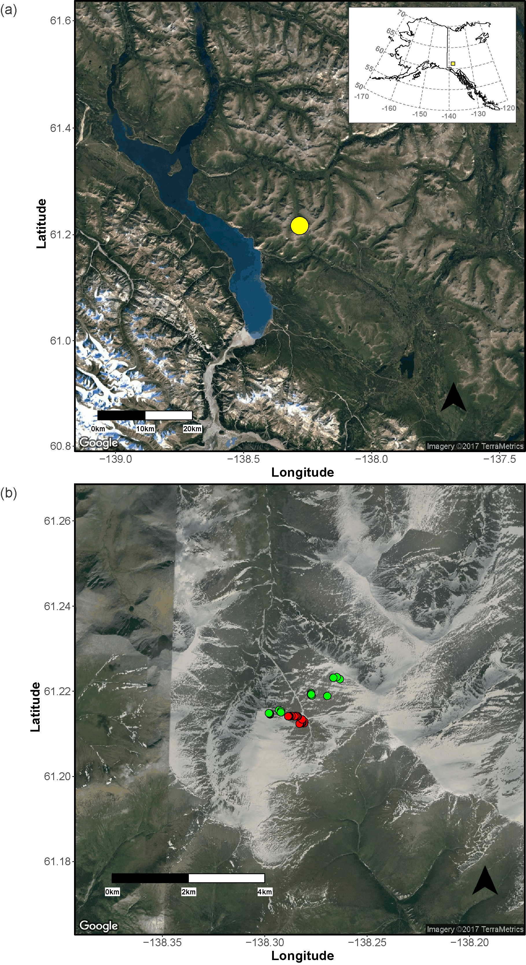 Figure 1. Location of the Kluane Region in the Yukon Territory northwest Canada indicated with a yellow square on the inset map and the location of the Pika valley (yellow circle) northwest of Kluane Lake (a). Satellite image map of the Pika valley and adjacent areas (b); sampling spots of Cassiope tetragona are marked with red dots; sampling locations of Salix pulchra are indicated with green dots.