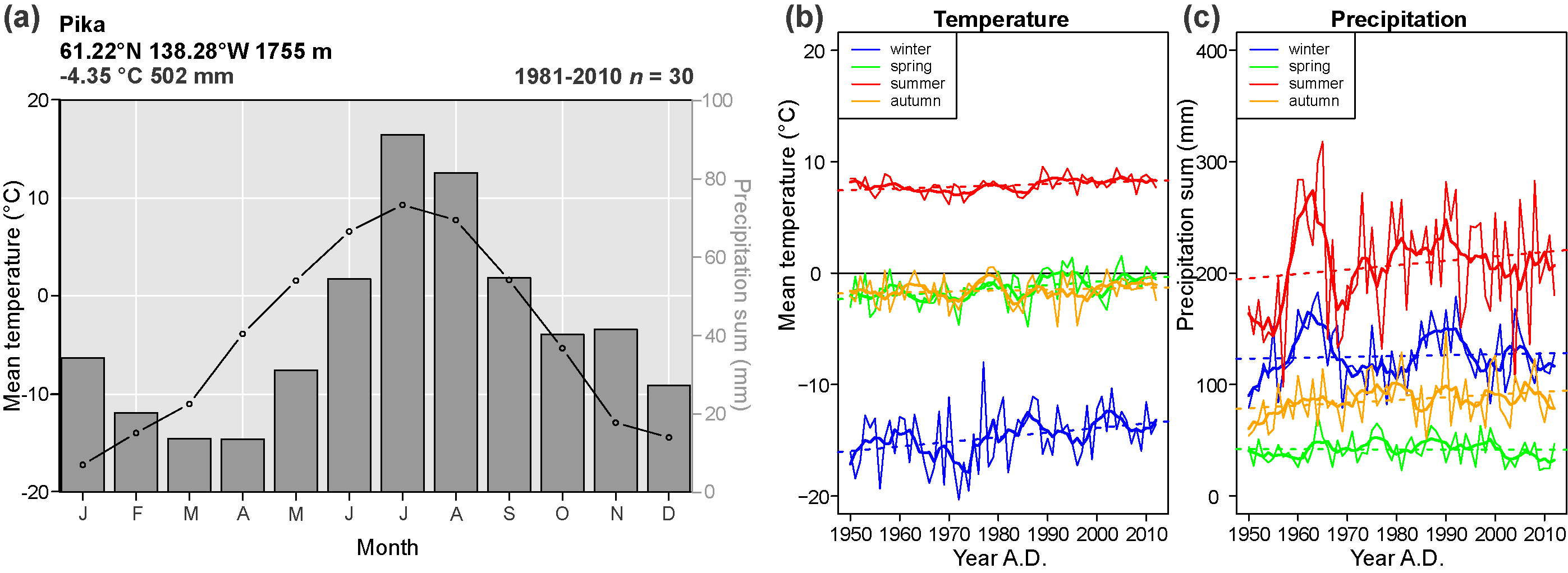 Standard image High-resolution imageFigure 2. Mean monthly air temperatures (°C; lines) and mean monthly precipitation sums (mm; bars) as calculated for the Pika valley in the Kluane Region, Yukon Territory, Canada in Climate WNA v5.40 (Wang et al 2017) (a). Coordinates (decimal degrees) are given below the site name, followed by the elevation (m a.s.l.). In the left-hand corner the mean annual temperature (°C) and mean annual precipitation sum (mm) are given. The period over which the monthly means were calculated is given in the upper right corner, followed by the number of years included in the calculation of the means (n). Lapse rate adjusted seasonal mean temperatures (b) and precipitation sums (c), as valid for our research site for the period 1950–2012. Thick lines are the 5 year running means through the annual seasonal values (thin lines). Dashed lines indicate the linear trends.