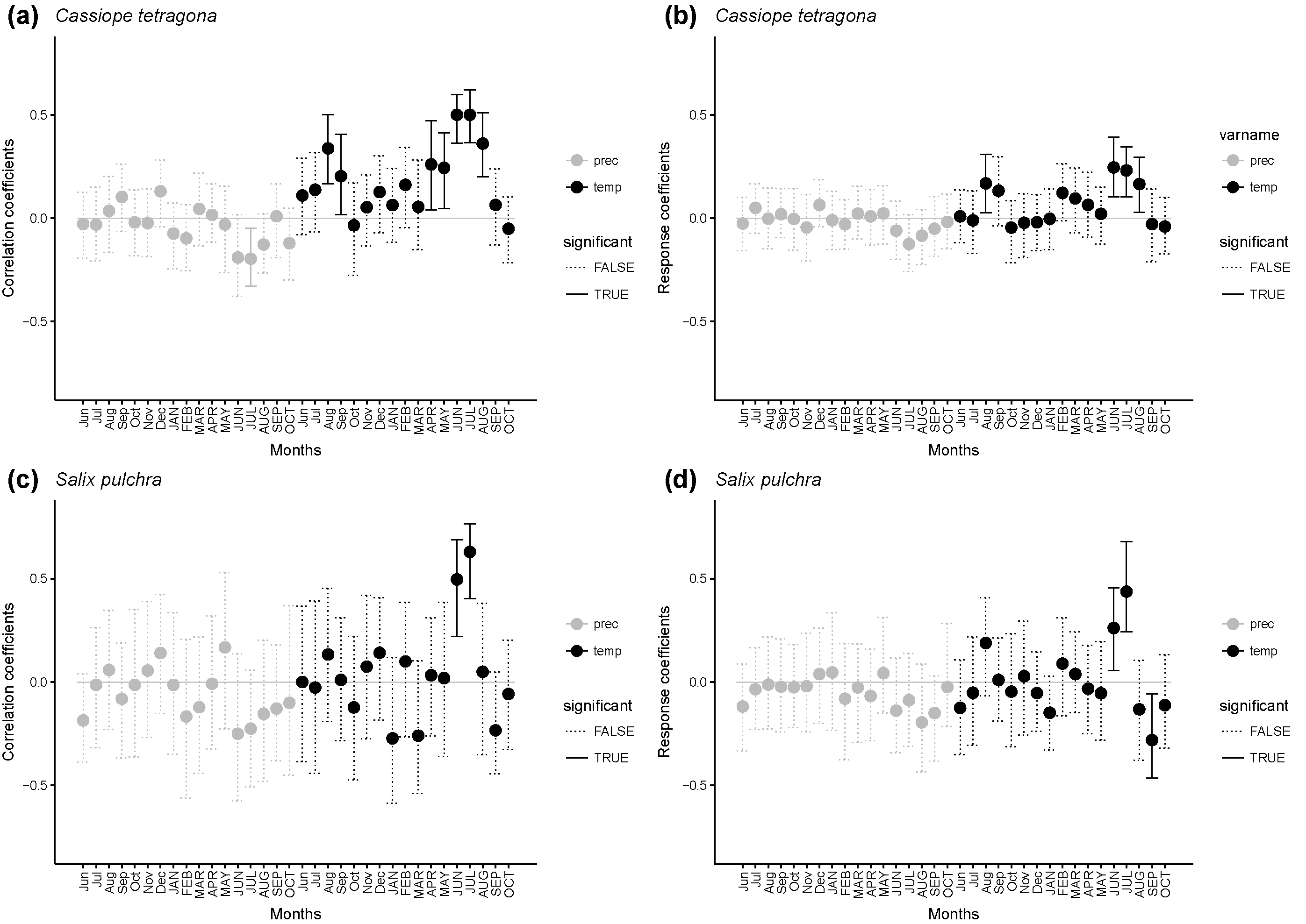 Figure 3. Pearson's correlation coefficients (a) and (c) and response function coefficients (b) and (d) with bootstrapped confidence intervals calculated between the standardized Cassiope tetragona (1907–2009) and Salix pulchra (1971–2006) site chronologies and monthly precipitation sums (grey) and mean monthly temperatures (black) as modelled for the Pika valley in the Kluane Region, Yukon Territory, Canada. Abbreviations of months from the year prior to growth are in lowercase letters and those of the current year are given in capitals.