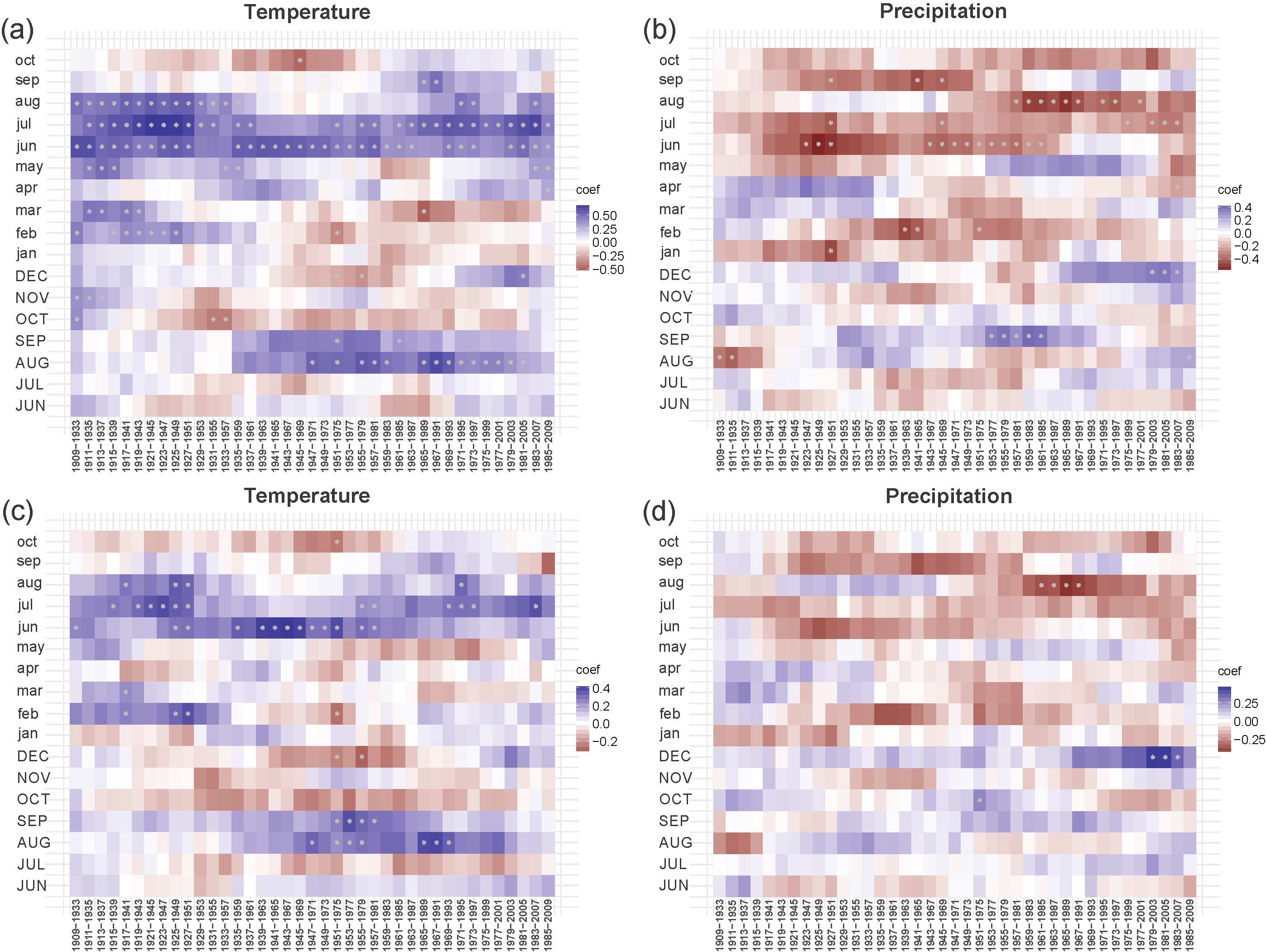 Standard image High-resolution imageFigure 4. Moving correlation coefficients (a) and (b) and response function coefficients (c) and (d), calculated over 25 year windows with 2 year offsets over the period 1907–2009, between the standardized Cassiope tetragona shoot length chronology and mean monthly temperatures as well as monthly precipitation sums, as modelled for the Pika valley, Kluane Region, Yukon Territory, Canada. Asterisks (⁎) indicate significant coefficients. Abbreviations of months from the year of growth are in lowercase letters and those of the previous year are given in capitals.