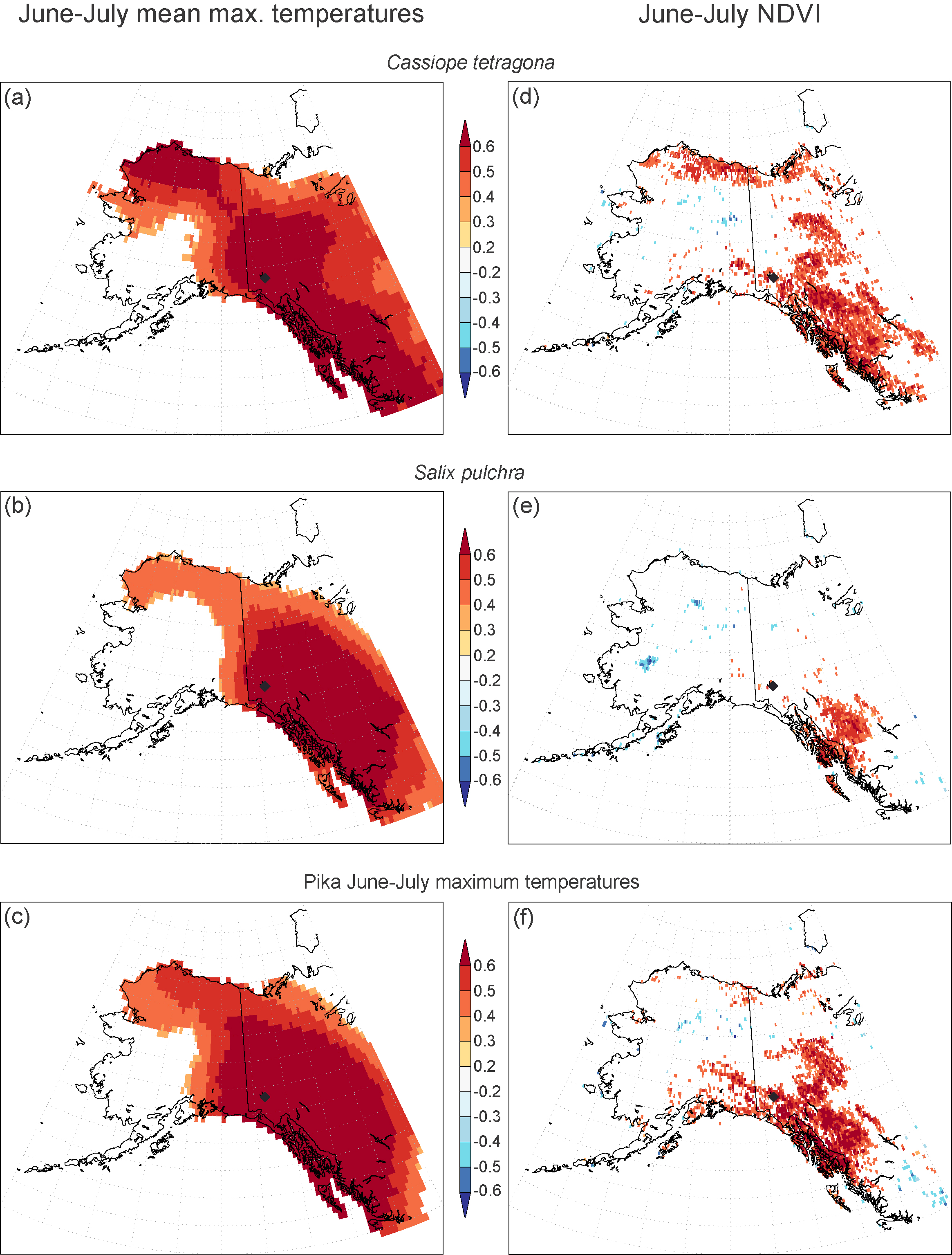 We have shown that Cassiope tetragona and Salix pulchra growth at the Pika valley in the Kluane Region, Yukon Territory, Canada is driven by early (June–July) growing season temperatures. Despite contrasting plant traits of dwarf evergreen versus tall deciduous shrubs and different habitats related to snow distribution, consistent climate sensitivity to early growing season temperatures was observed. Early summer temperatures, which coincide with the time of year with maximum insolation, are warming across northwest North America and shrub growth chronologies for both species were correlated with the regional climate and showed spatial correspondence with interannual variation in NDVI in surrounding alpine and Arctic regions. Our results suggest a common driver of vegetation change for contrasting shrub species growing in different habitats in the same alpine environments.
