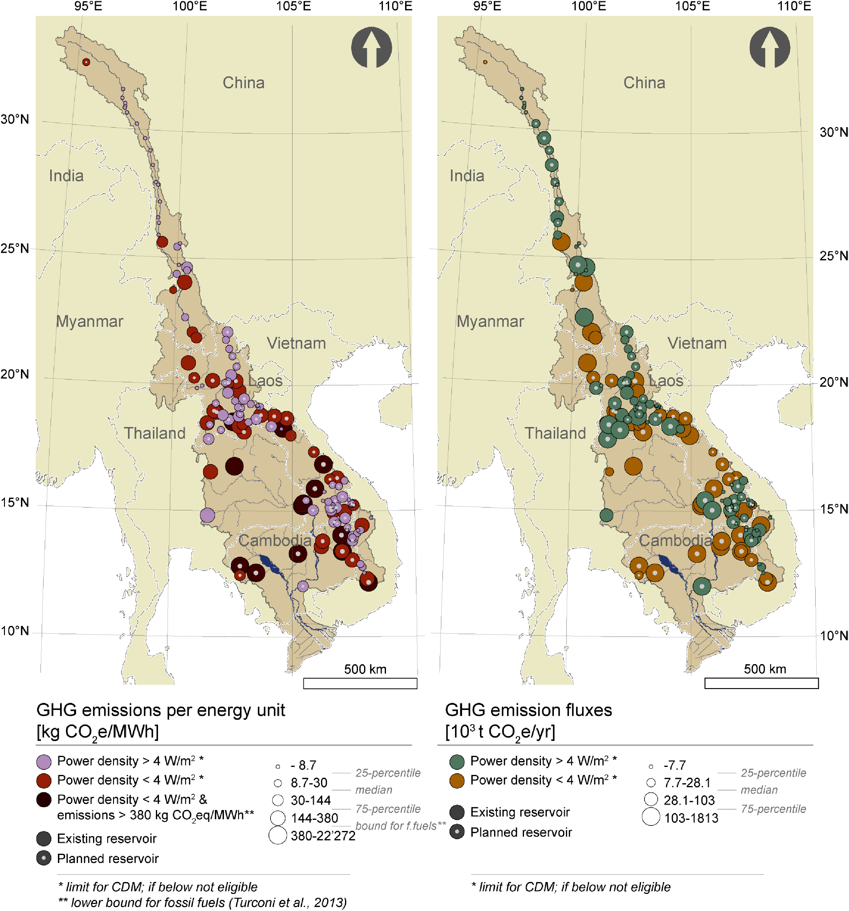 Table 4. Fifteen future reservoirs with highest estimated CO2e emissions over a 100 year lifetime in the Mekong River Basin. The table also shows power densities for each reservoir. A power density above 4 W m−2 makes hydropower projects eligible for the CDM (UN 2017).