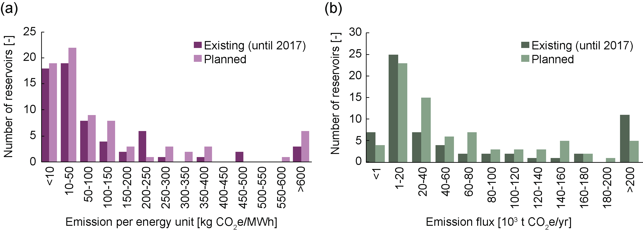 Figure 2. Estimated frequency distribution of (a) emissions per energy unit and (b) emission flux of 141 existing and future reservoirs in the Mekong Basin. Emissions are given as averages over a100 year lifetime.