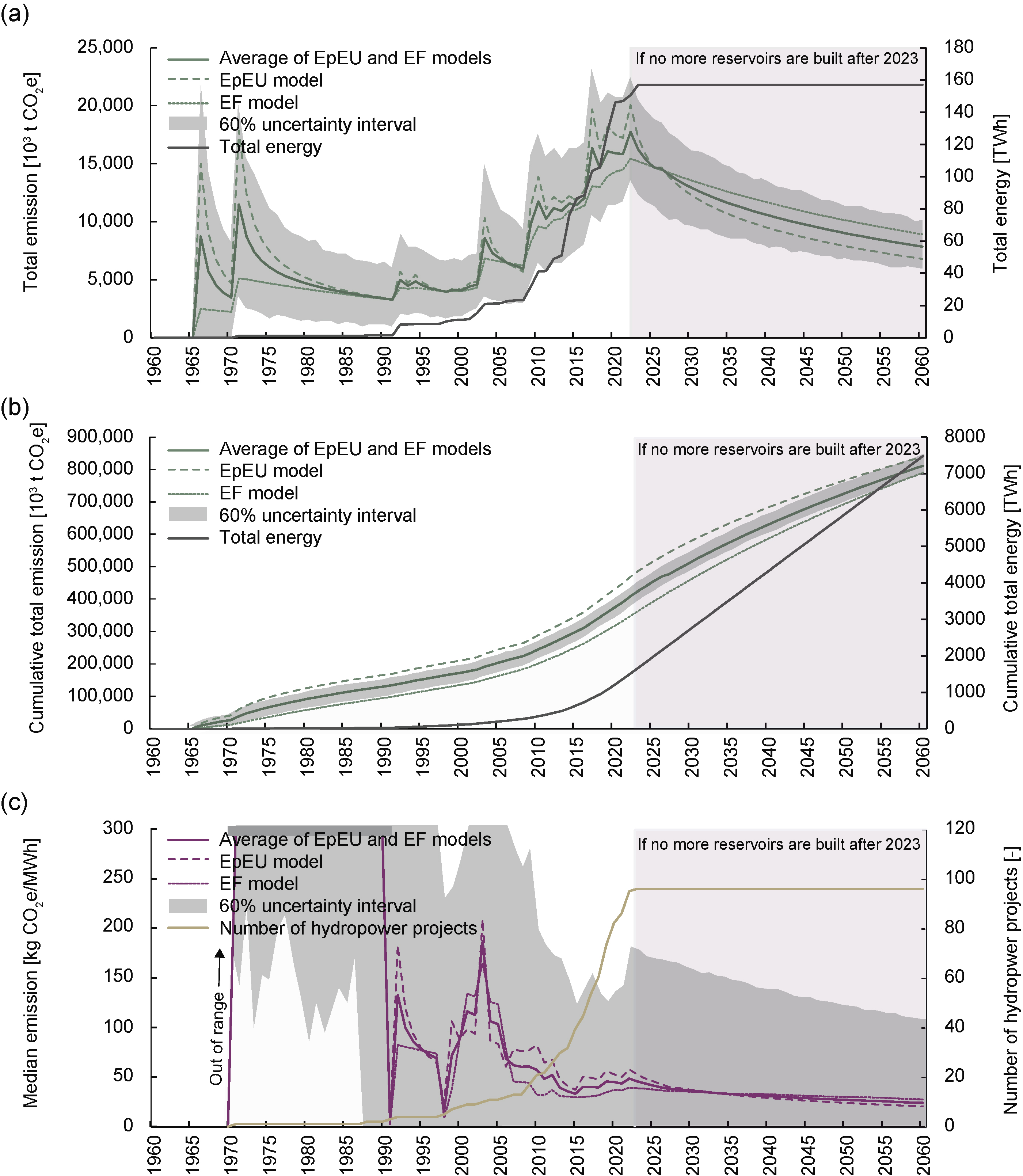 Figure 3. Estimated CO2e emission of reservoirs in the Mekong River Basin: (a) total annual emissions, (b) cumulative total emissions and (c) median emission per energy unit. The estimates in tiles A and B include 111 reservoirs with known or planned commission years until the year 2023 and excludes 30 planned reservoirs with unknown commission year. The estimate in tile (c) includes 97 hydropower reservoirs of these 111 reservoirs (i.e. includes only hydropower reservoirs and excludes reservoirs also serving irrigation). The grey shading is the 20–80 percentile uncertainty interval for emissions. Note: in tile (c) the emission data is out of range from the 1970s to the early 1990s due to estimated high emissions of Nam Ngum 1, the small number of hydropower reservoirs in early years of analysis, and the use of the median as metric.