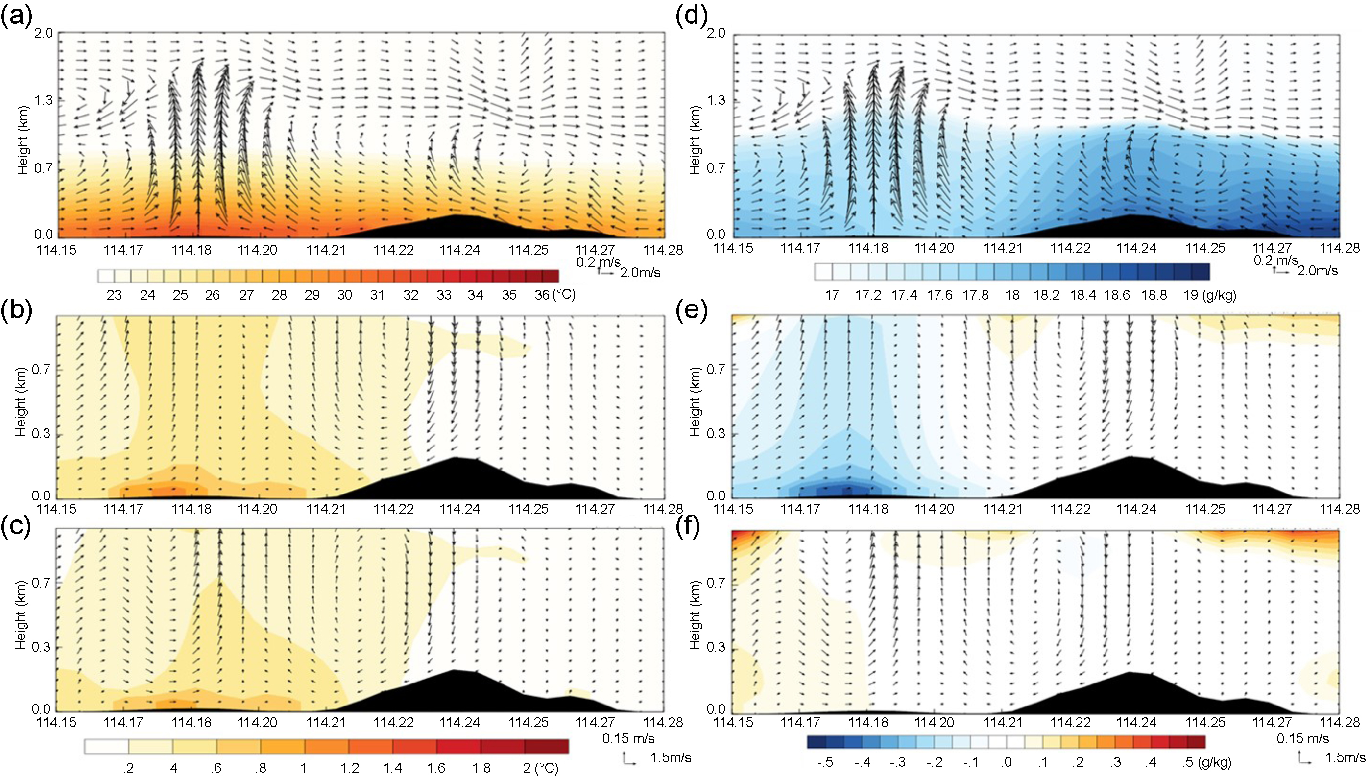 Standard image High-resolution imageFigure 10. Vertical east–west cross-section (transect A–B, shown in figure 7(a)) at 06:00 UTC on June 24, 2016, of (a) simulated wind fields (m s−1) (vectors) and temperature (°C) (shaded) above ground level up to 2.0 km for the Baseline Case; (b) difference in wind fields (m s−1) (vectors) and temperature (°C) (shaded) above ground level up to 1.0 km (referring to the Baseline–CPCT case); (c) similar to (b) but for the Baseline–DCS case; (d) simulated wind fields (m s−1) (vectors) and water vapor mixing ratio (g kg−1) (shaded) for the Baseline case; (e) difference in wind fields (m s−1) (vectors) and water vapor mixing ratio (g kg−1) (shaded) above ground level up to 1.0 km (referring to the Baseline–CPCT case); and (f) similar to (e) but for the Baseline–DCS case.