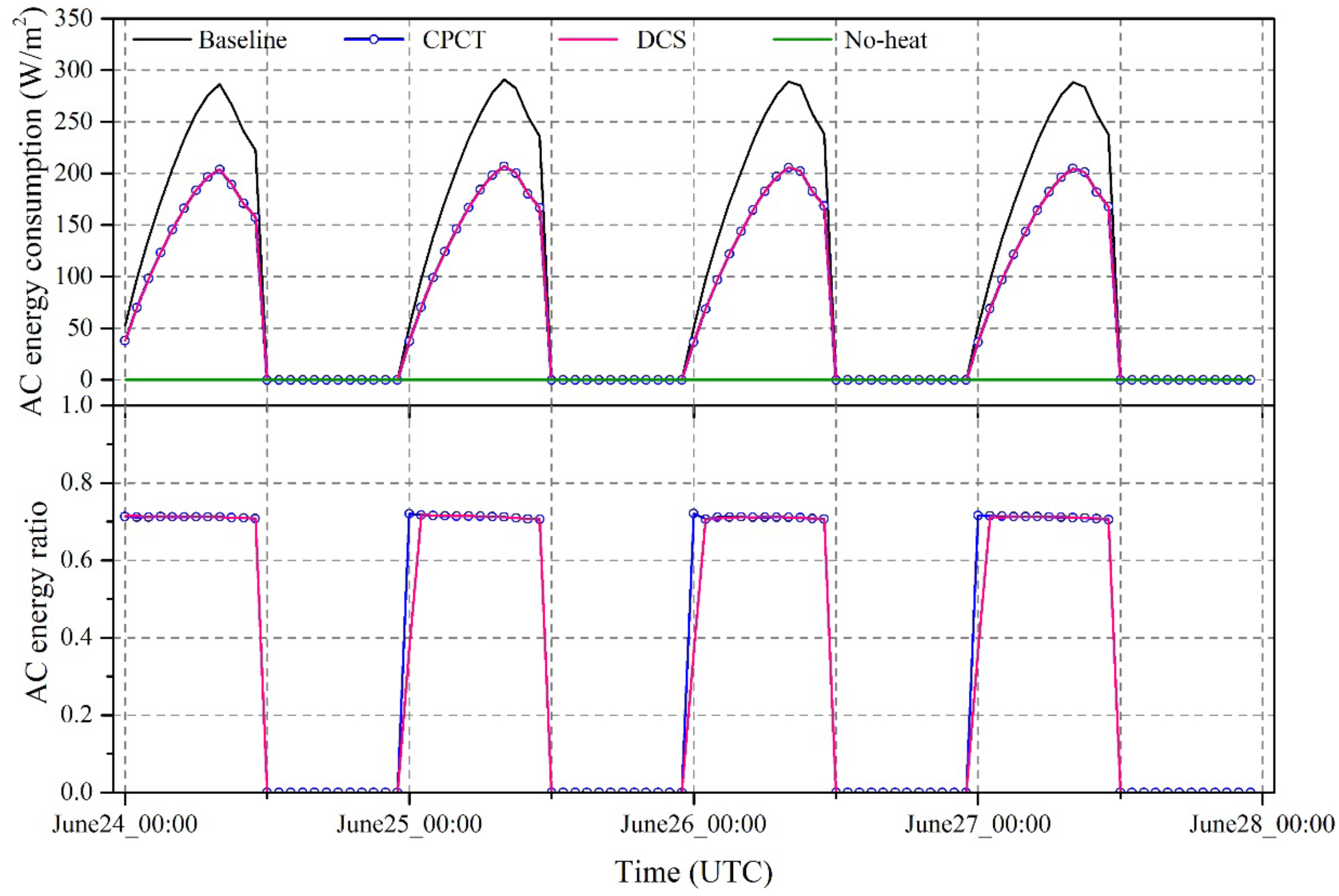 The energy consumption using different air-conditioning systems is investigated, and in this study, the COP for the Wall_type, Baseline, CPCT, and DCS cases are set as 2.0, 2.5, 3.5, and 3.5, respectively, on the basis of the findings of other studies (Ashie et al 1999, Ho et al 2007, Salamanca et al 2010, Huang et al 2013). Figure 11 shows the averaged air-conditioning fluxes in the non-domestic areas (as shown in figure 6) and the energy saving with the alternative air-conditioning systems referring to the Baseline case. The results clearly show that in the CPCT and DCS cases, the energy consumption of the air-conditioning systems was effectively reduced, with 30% energy savings in comparison to that in the Baseline case. Note that here, the cost of changing the systems and maintenance is not considered. In making the decision to choose alternative systems, one must consider the competing benefits and disadvantages.