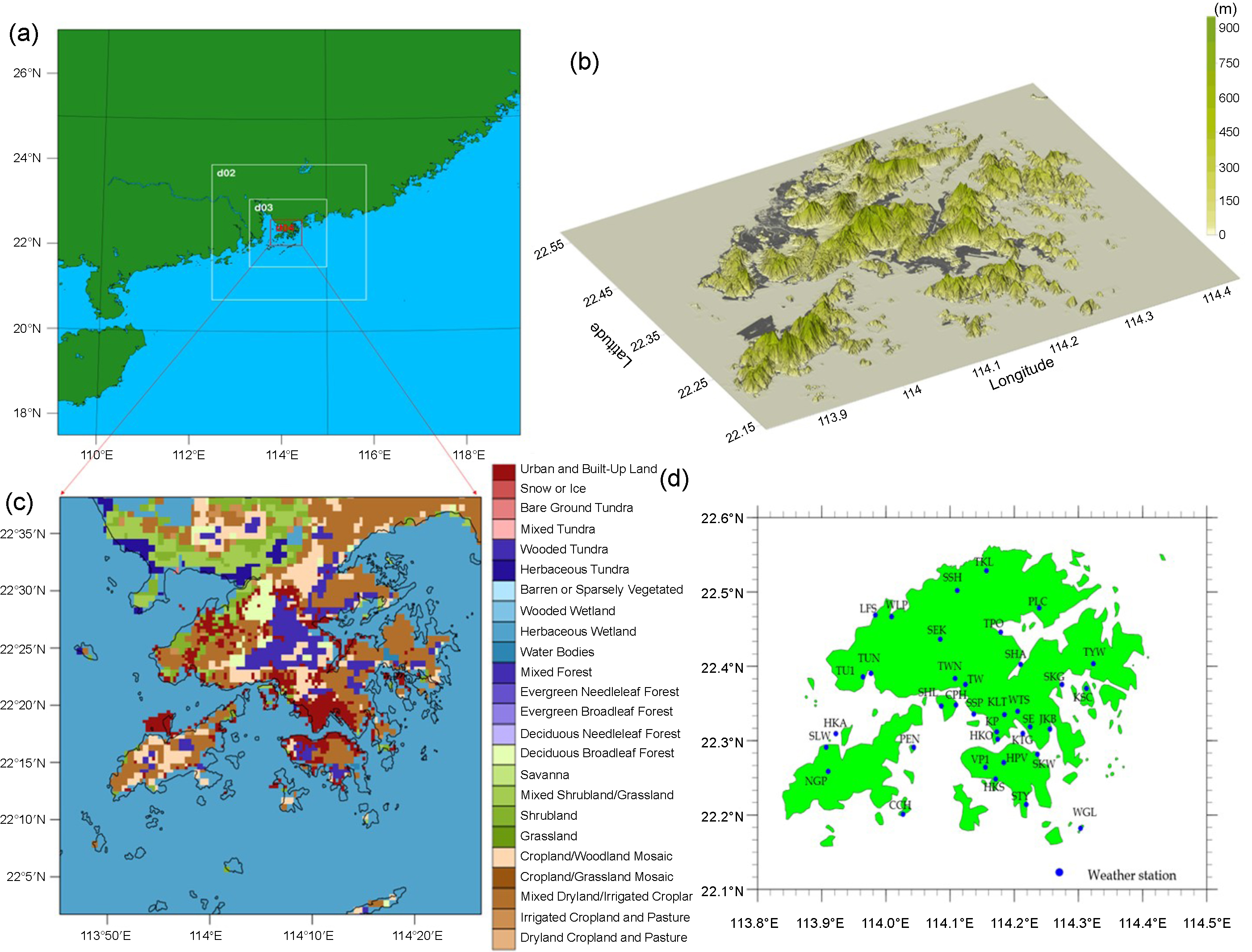Figure 1. (a) WRF modelling domain; (b) topography of Hong Kong; (c) land cover and land use for the innermost domain with grid resolution of 0.5 km; (d) location of weather stations.