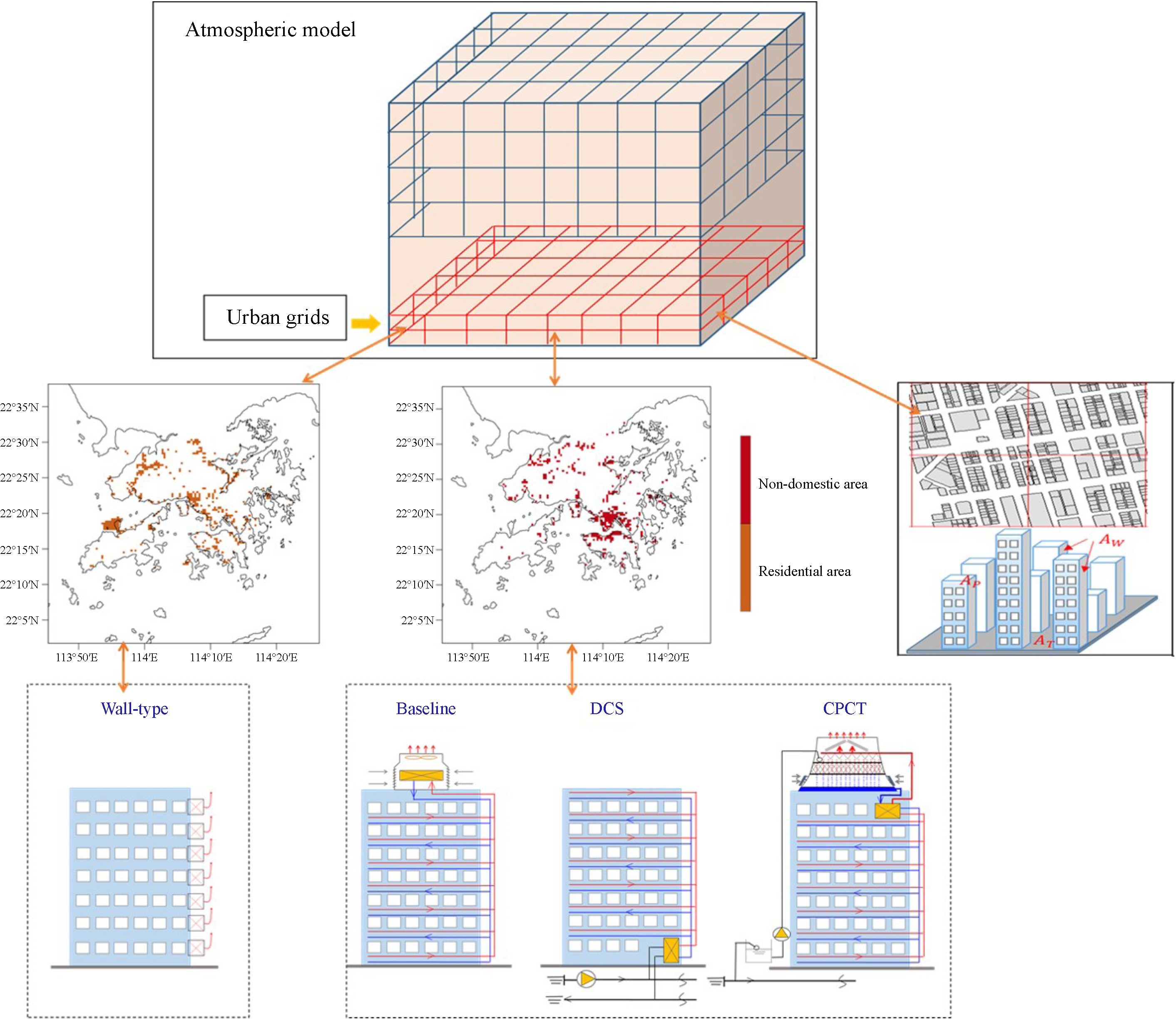 Hong Kong has a large spatial and vertical land surface heterogeneity (figure 1(b)). To better represent the dynamics and thermal interacts in the urban canopy layers, multilayer building effect parameterization (BEP, Martilli et al 2002) and the building energy model (BEM, Salamanca et al 2010) were chosen. The multilayer canopy model, BEP/BEM, with a revised drag coefficient, based on plan area fraction, λp, has been tested over Kowloon Peninsula in Hong Kong, and has shown reasonably good results for capturing spatial air temperature distribution, diurnal wind rotation, and stagnation wind phenomena in the lower level convergence zone due to the combination of urban heat island circulation and sea-land breeze circulation (Wang et al 2017). The latest gridded building information and land cover and land use data (figure 1(c)) were used for the entire Hong Kong area for better representation of spatial heterogeneity. The default air-conditioning system in BEM is the wall-type scenario (shown in figure 2) in all urban areas. In this study the wall-type air-conditioning system is assumed to be used only in residential areas and central air-cooled air systems in non-domestic areas according to the real situation in Hong Kong (shown in figure 2). To study the effect of air-conditioning systems in non-domestic areas on the urban climate in the city of Hong Kong, several configurations or scenarios of air-conditioning systems (shown in figure 2) in non-domestic areas were simulated, as summarized in table 1.