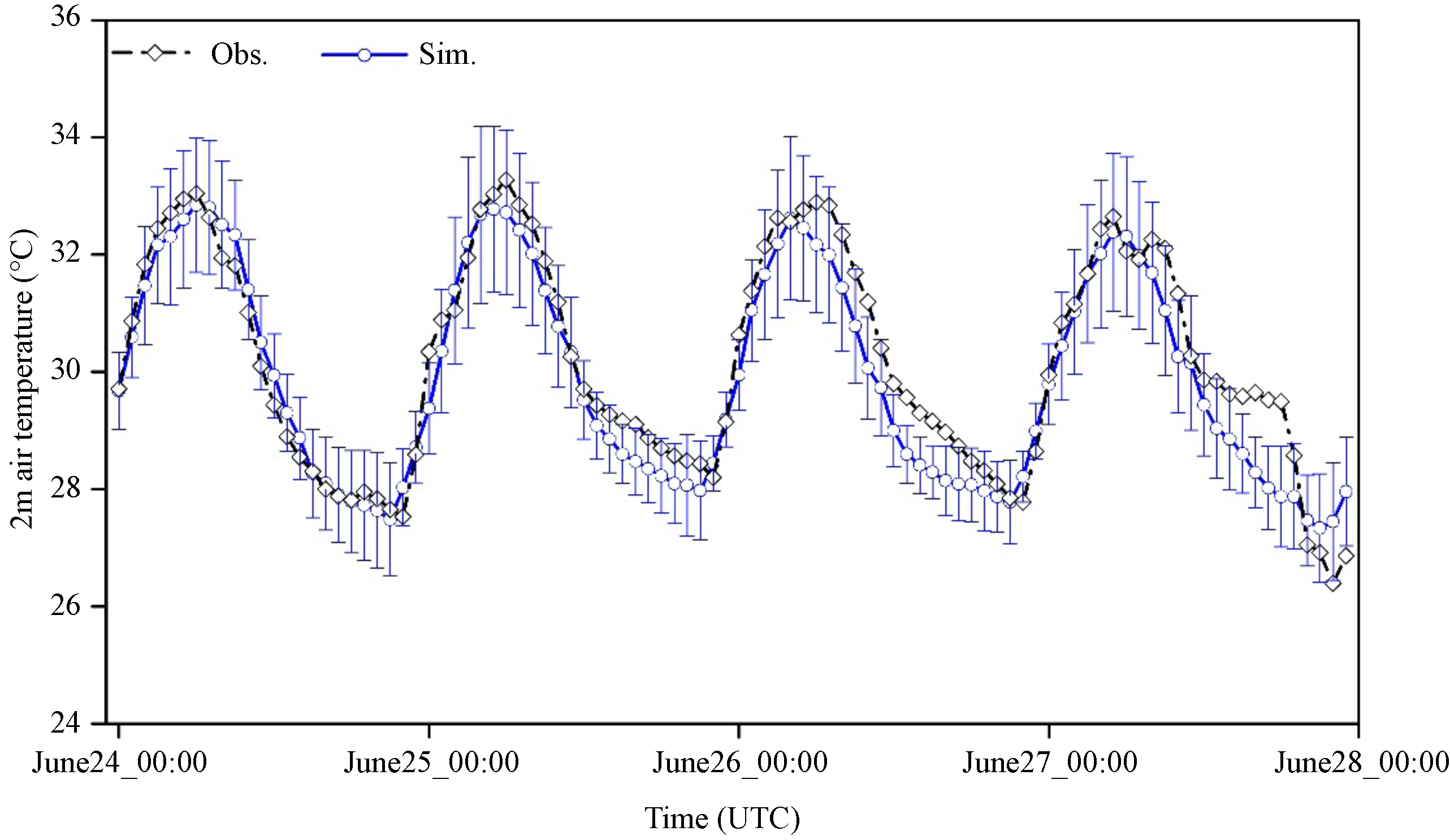 Standard image High-resolution imageFigure 4. Comparison of observed and simulated 2 m air temperature from 00:00 24 June to 00:00 28 June, 2017.