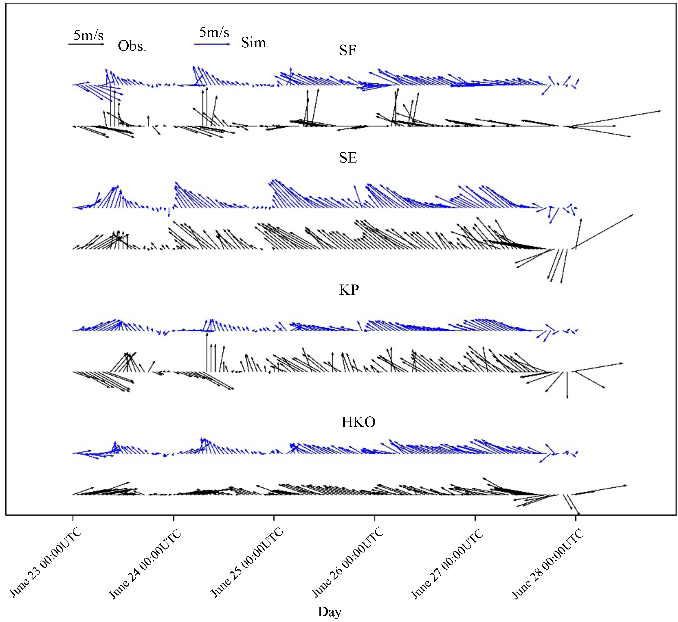 Standard image High-resolution imageFigure 5. Comparison of observed and simulated surface wind fields at HKO, KP, SE and SF stations. The locations of the four stations are shown in figure 1(d).