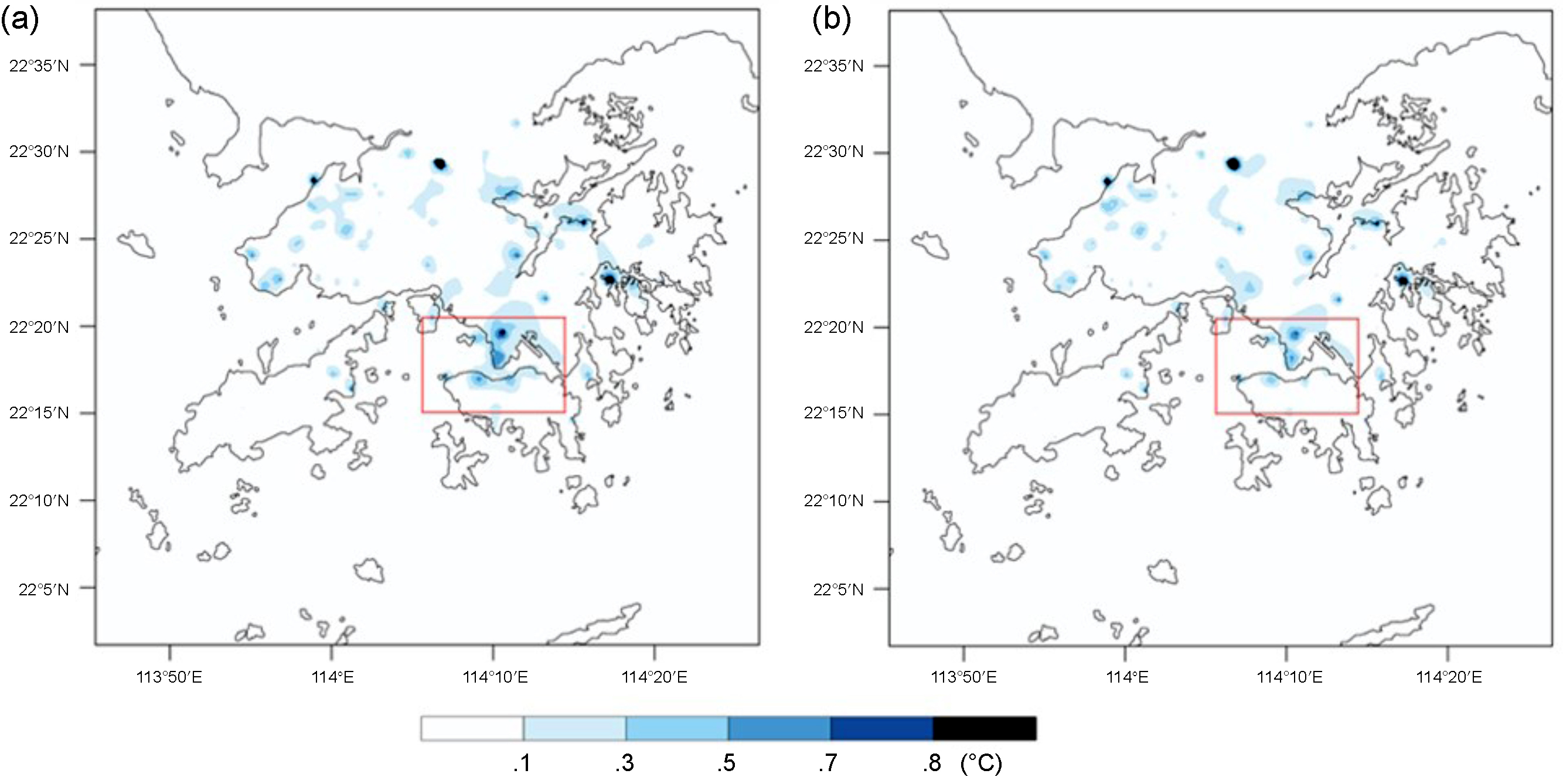 Standard image High-resolution imageFigure 6. (a) Modeled mean 2 m air temperature differences (Baseline case–DCS case) averaged for June 24–28, 2016, from 8:00 am to 8:00 pm. (b) Same as (a) but for the Baseline case–CPCT case. The rectangular areas in (a) and (b) denote the areas that have been illustrated in figures 5 and 6.