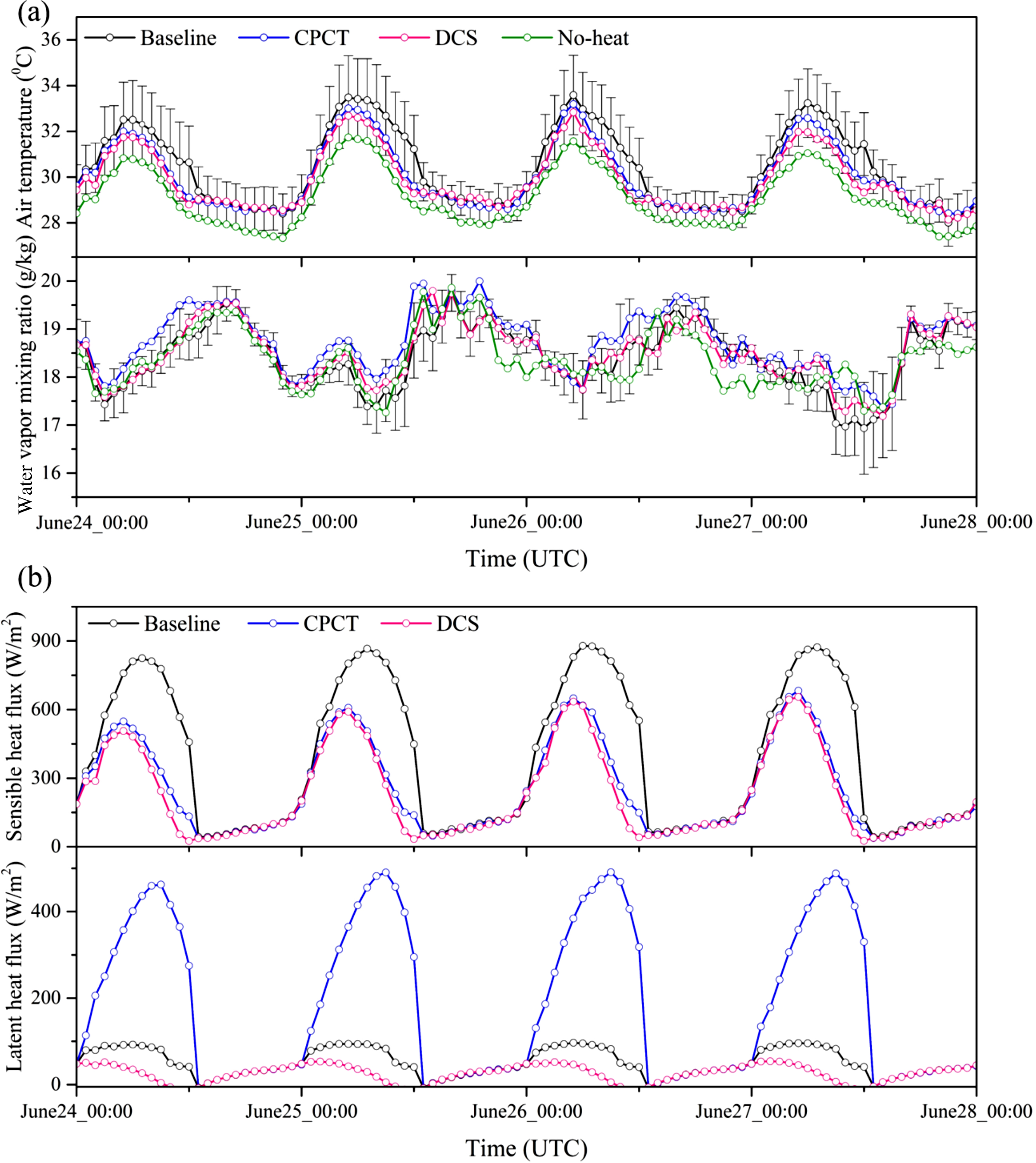 Standard image High-resolution imageFigure 7. (a) Comparison of mean 2 m air temperature and water vapor mixing ratio in non-domestic areas in the specific areas illustrated in figure 4 for the Baseline case, CPCT case, DCS case, and no-heat case; (b) similar to (a) but for mean sensible and latent heat fluxes. Note here that the vertical bars in (a) denote the standard deviation of the air temperature and the water vapor mixing ratio for the Baseline case.