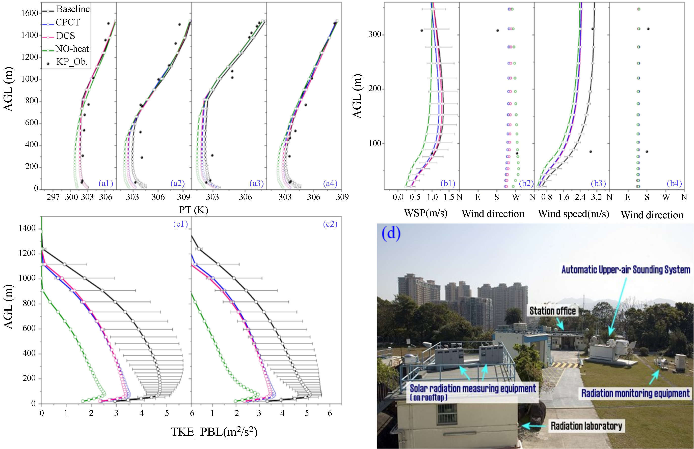 Standard image High-resolution imageFigure 8. Comparison of mean potential temperature (K) in the nine grid points near King's Park station for the Baseline case, CPCT case, DCS case, and no-heat case, and the observation value at (a1) 00:00 UTC and (a2) 12:00 UTC on June 24, and (a3) 00:00 UTC and (a4) 12:00 UTC on June 25, 2016; similar to (a1)–(a4) but for mean wind speed and wind direction at (b1, b2) 00:00 UTC and (b3) and (b4) 12:00 UTC on June 24, 2016; similar to (a1)–(a4) but for mean TKE_PBL at 06:00 UTC on (c1) June 24, and (c2) June 25, 2016; (d) shows the layout and the instruments of King's Park Meteorological Station. Note here that the horizontal bars denote the standard deviation of specific parameters (source: www.hko.gov.hk).