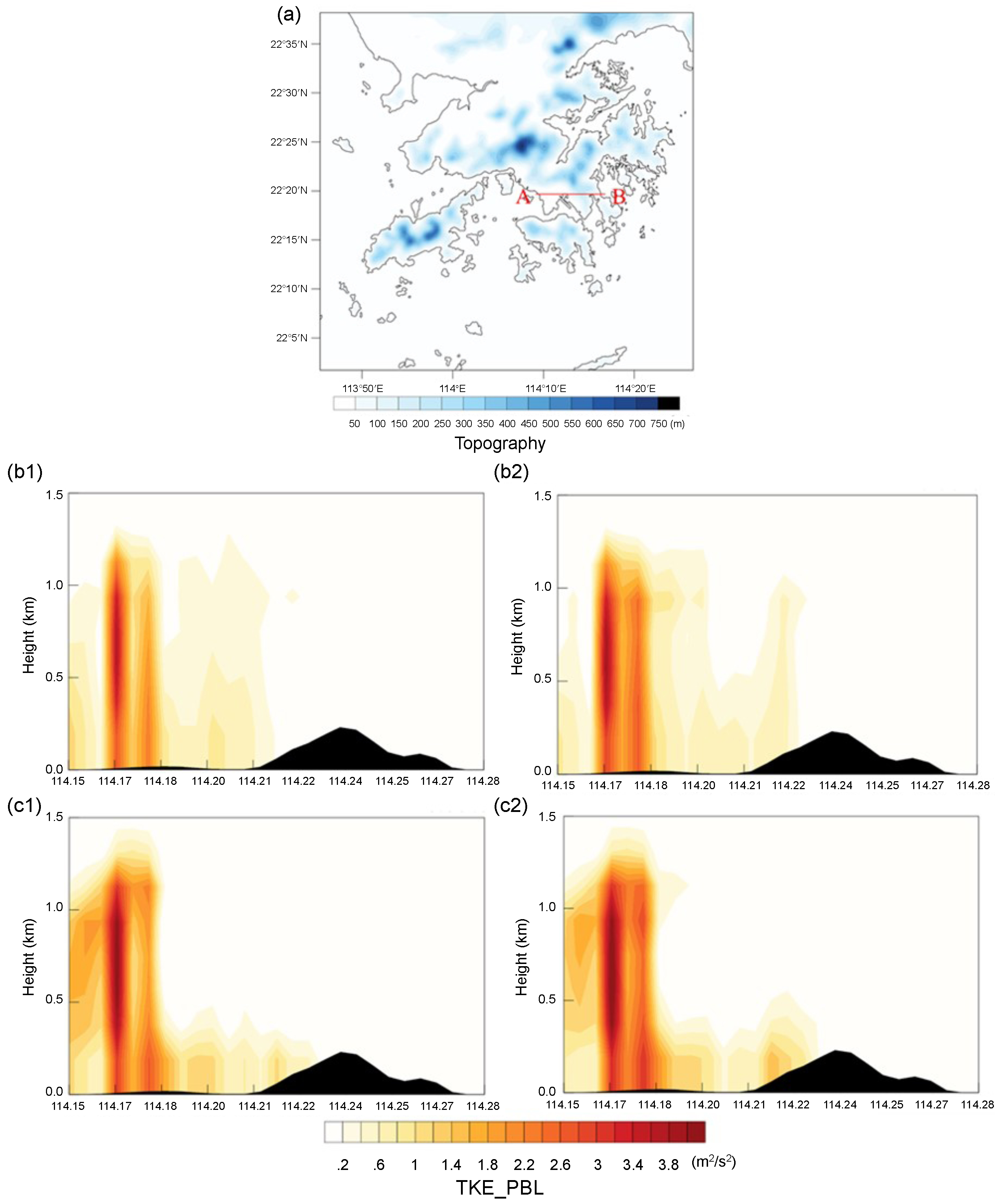 Figure 9. Vertical east–west cross-section (transect A–B, shown in (a)) of the difference in TKE_PBL (m2 s−2) above ground level up to 1.5 km at 06:00 UTC on (b1, referring to the Baseline–CPCT case) and (b2, referring to the Baseline–DCS case) June 24, 2016, and at 06:00 UTC on (c1, referring to the Baseline–CPCT case) and (c2, referring to the Baseline–DCS case) June 25, 2016.