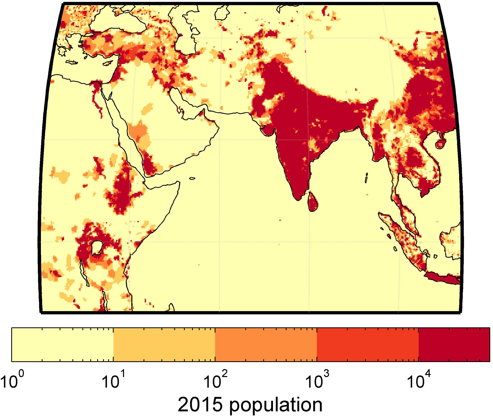 Figure 2. Observed population count over the SAEA region for the year 2015. Data is presented at 0.25° × 0.25° horizontal resolution, and provided by the Gridded Population of the World version 4 (GPWv4) dataset, administered by the NASA Socioeconomic Data and Applications Center (SEDAC) and hosted by the Center for International Earth System Information Network (CIESIN, doi: https://dx.doi.org/10.7927/H4X63JVC).