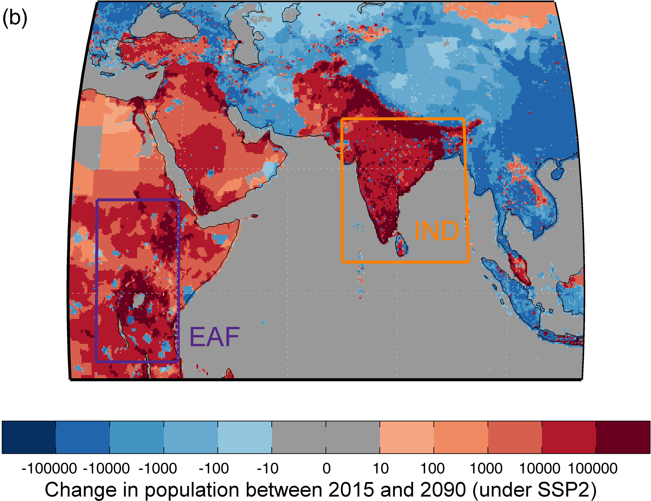 Figure 3 shows changes in absolute population between 2015 and 2090 under the two SSP scenarios considered. Both population data sets were first interpolated to a common 0.25° × 0.25° resolution before calculations were made. Under both scenarios, there are two large-scale patterns of population change which emerge: (1) widespread decreases in population over many mid-latitude regions, including Central Asia and China, as well as large regions of South-east Asia; and (2) robust increases in population over the Middle East, parts of Pakistan and Afghanistan, and most notably over widespread areas of Eastern Africa, including already densely-populated regions in Ethiopia, Kenya, Tanzania and Uganda. Whilst more obvious under SSP2, smaller but more concentrated patterns of growth also exist under SSP1 over parts of East Africa, Turkey and even India—a feature likely indicative of continued urban intensification (Jiang and O'Neill 2017). Interestingly, population projections across India are more divergent than other regions: negligible changes in total population between 2015 and 2090 are found under an SSP1 scenario, while at least another 400 million people will inhabit the region under an SSP2 scenario (KC and Lutz 2017). Such large variations in trajectories between the scenarios for different regions can be primarily linked to (a) differences in present-day population age structures, and (b) the differing prospects of changing education rates for younger adult females (aged 20–39, KC and Lutz 2017).