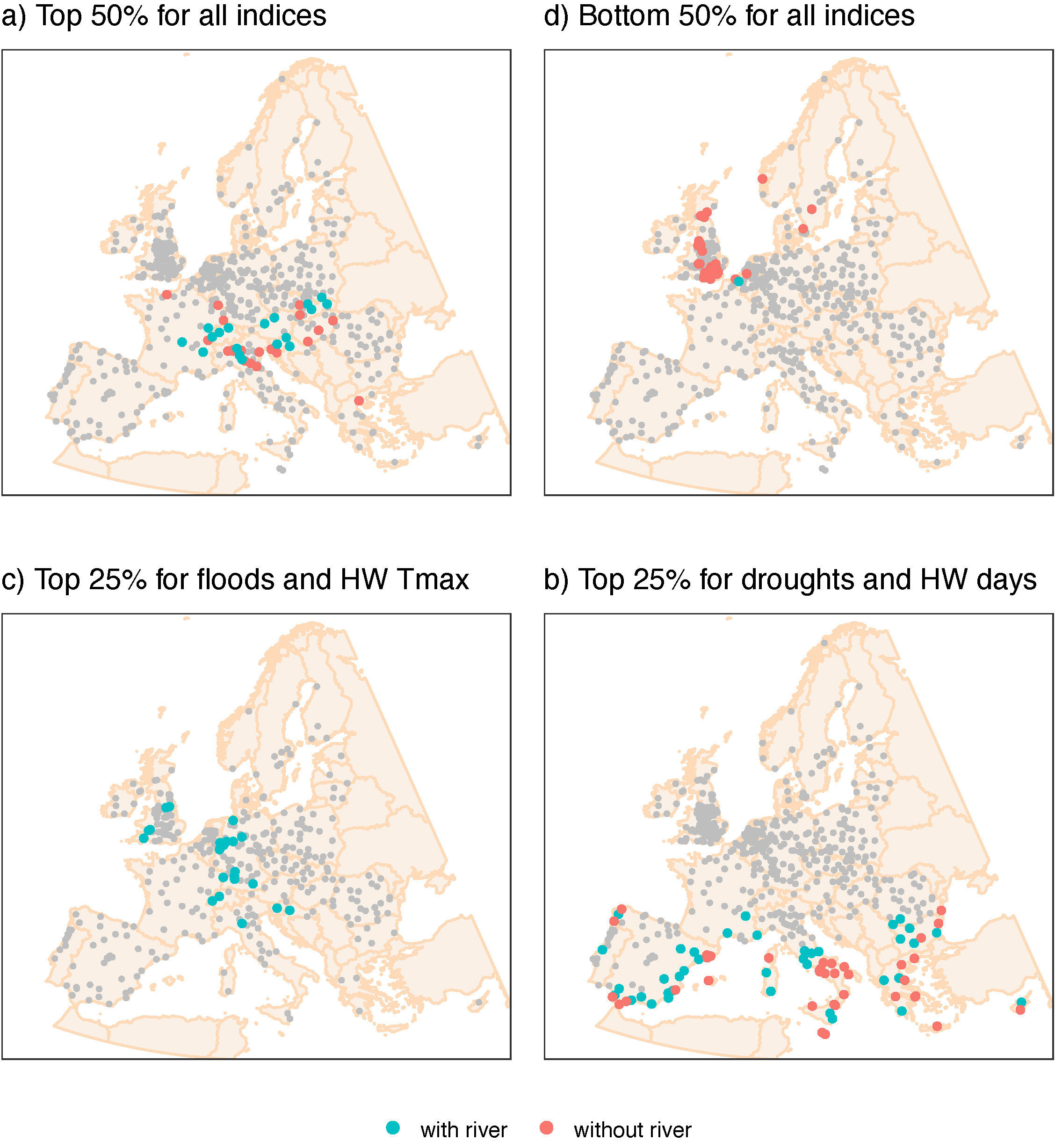 Standard image High-resolution imageFigure 6. (a) Cities whose changes are in the top 50% for all indices (i.e. changes in number of heat-wave days, changes in maximum daily maximum temperature for days classified as heat-waves days, changes in probability for any given month in the future being above the historical maximum DSI-12, maximum DSI-12 change factor and, for the cities with rivers, changes in Q10 ratio). (b) Cities whose changes are on the bottom 50% for all indices. (c) Cities whose changes in both flooding and maximum temperature during a heat-wave indices are in the top 25%. (d) As (c) but for both drought indices and changes in number of heat-wave days. Changes are calculated between the historical period (1951–2000) and the future period (2051–2100) for the high-impact scenario. Flood risk was analysed if the maximum flow accumulation cell within the city corresponded to a catchment area of at least 500 km2 (i.e. city 'with river').