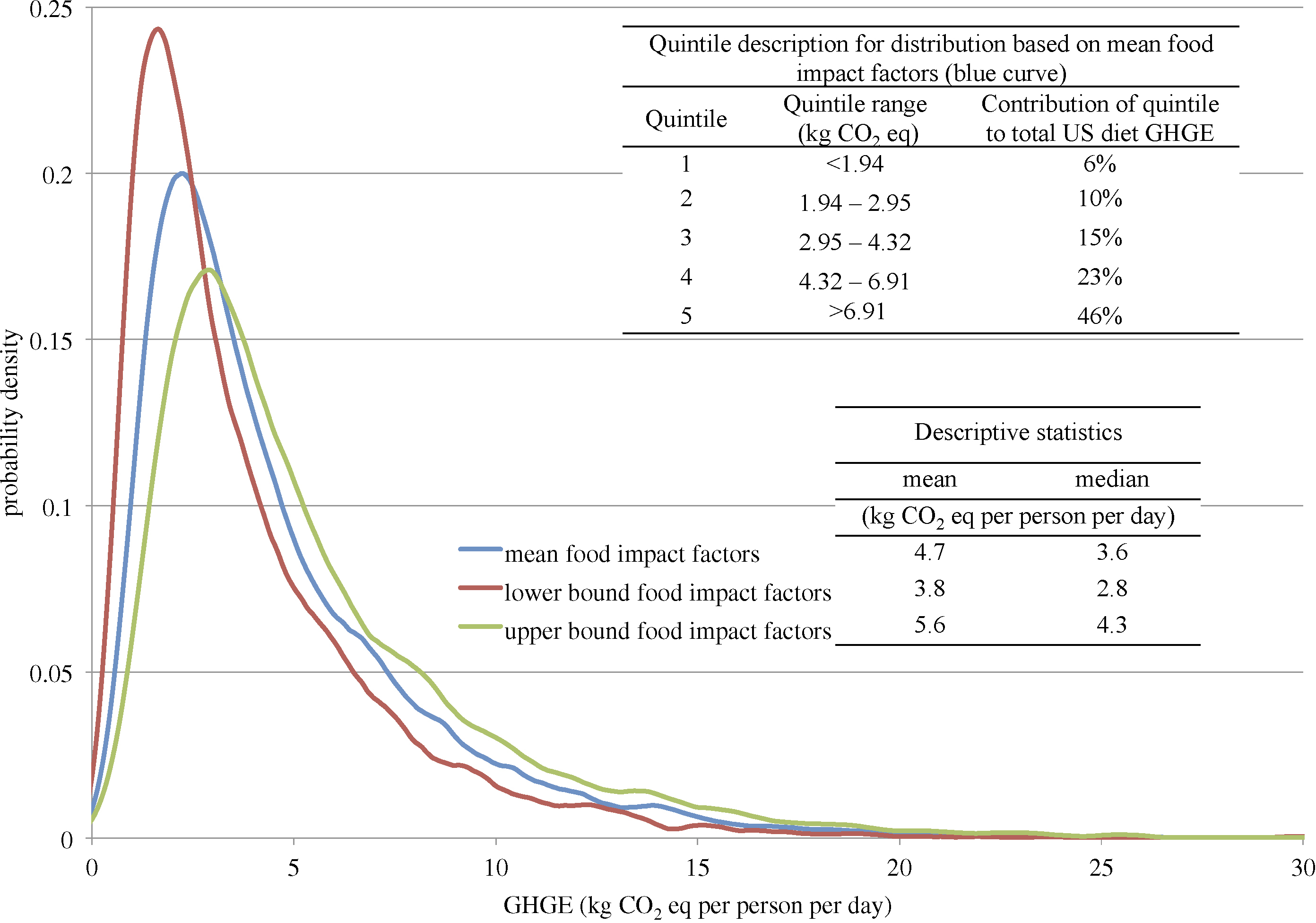 Figure 1. Distribution of diet-related GHGE per person per day among US adults, National Health and Nutrition Examination Survey 2005–2010. Data are based on one 24 hour dietary recall per person and include estimated retail- and consumer-level food losses. Distribution in blue is based on using the mean impact (GHGE/kg food) for each food in our database. Distributions in red and green are based on impact factors (GHGE/kg food) at the lower and upper bounds, respectively, of a 95% confidence interval around these mean estimates of impact for each food.