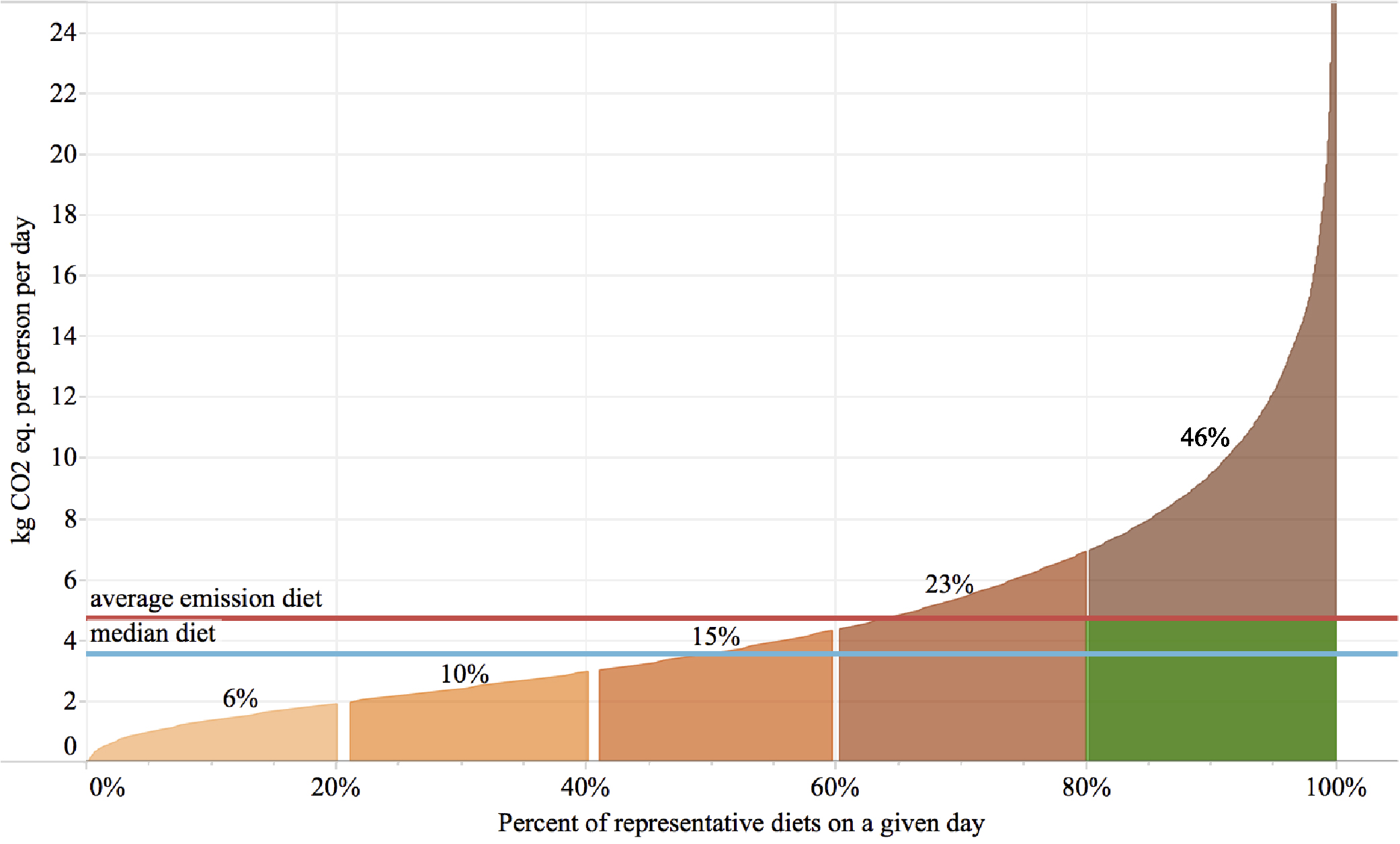 Figure 2. Cumulative emission intensity of US 1 day diets using average impact factors. Diets are ranked in order of impact from low to high. Areas under the curve are proportional to the total impact, with percentage contributions by each quintile shown above the curve. The green box represents the cumulative emissions of those originally in the 5th quintile if their diets were to shift to diets with average emission intensities.