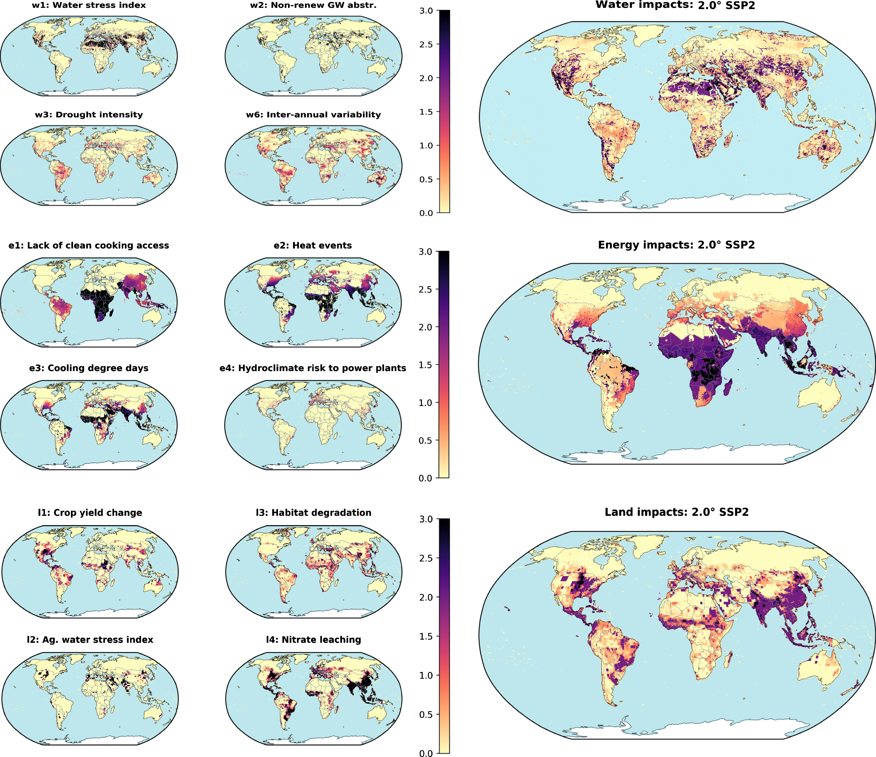 Figure 1. Sectoral score (0–3) maps for 2 °C GMT warming scenario. In the left column the individual indicators are shown, in the right column are the sectoral scores. Note that only four of the six water indicators are shown. Full indicator and sectoral exposure data available in SI tables S7–8.