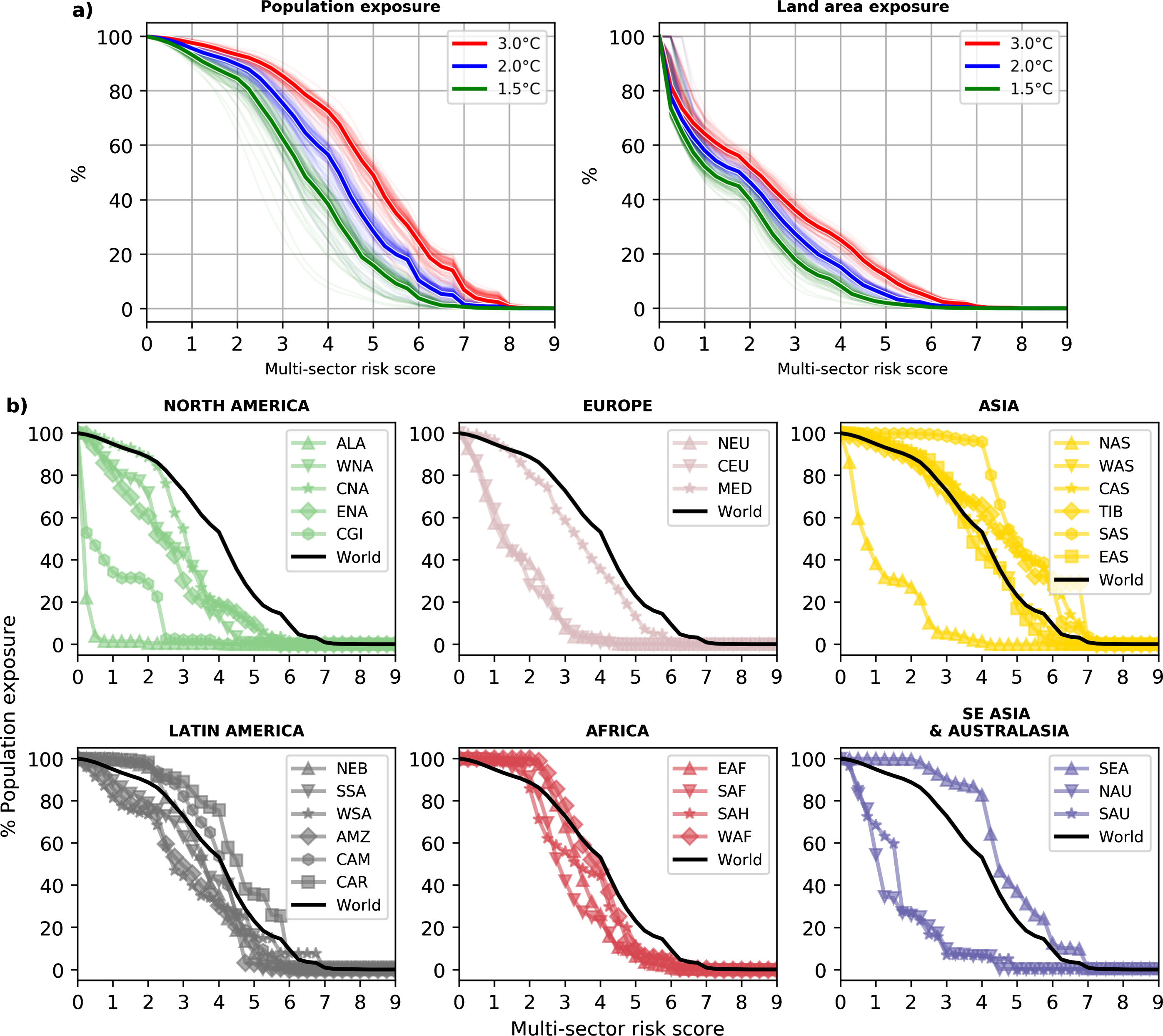 Figure 3. Distributions of global population and land area exposure to multi-sector risk score in 2050 with SSP2 population. Top panel (a) shows the exposure aggregated for the whole world by population and land area. Shaded areas around the lines represent the indicator score ranges uncertainty (Methods 2.5, and SI 1.4). Lower panel (b) is the population exposure for over 27 IPCC land regions (SI table S4 for three letter region codes). Noticeably, the differences in MSR on population, according to GMT, are most pronounced when MSI ≈4.0. At this level, population exposed in 1.5 °C is less than half that of a 3 °C climate. Land area exposure differences are smaller, as some of the impacts indicators are more driven by population. The differences between regions (b) are substantial, for example all North American subregions are below the global median exposure, whilst almost all Asian regions are above.
