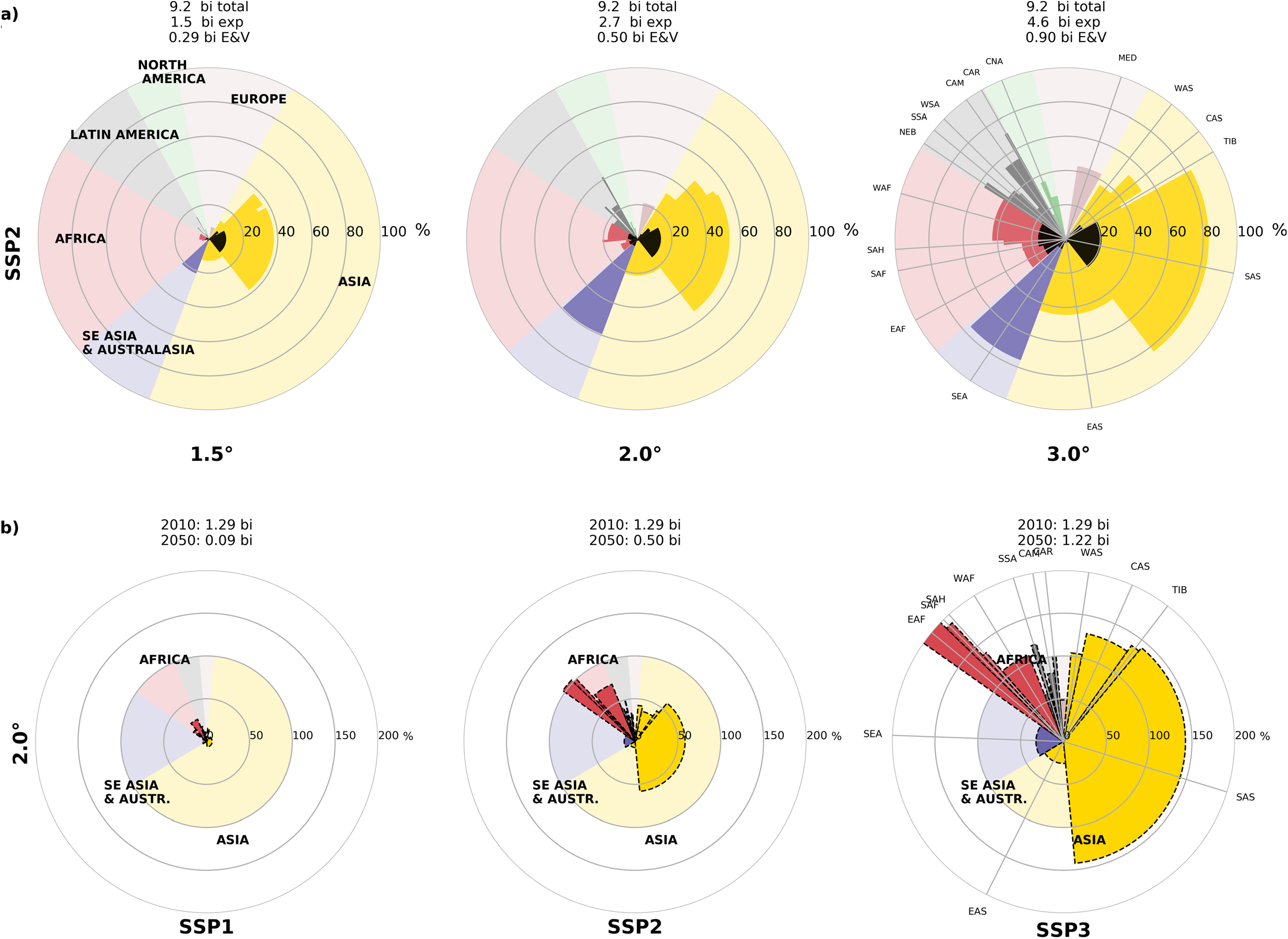 Figure 4. Global population exposure and vulnerability. Upper row (a) background is the total global populationin 2050 for SSP2, whilst in the foreground, the fraction of exposed population (MSR ≥ 5.0, strongcolours). Black shaded central segments are the exposed and vulnerable (E&V) population. For global exposure, GMT is the dominant driver over SSP population. However, the lower panel (b) shows how important socioeconomic development is for reducing the E&V population. It compares, for a 2 °C climate, the E&V population in 2010 (background circle, currently 4.2billion), compared with the projected E&V population in 2050 in the foreground. Whilst poverty reduction in SSP1 almost eradicates the E&V population in most regions by 2050, SSP3 results in substantial increases compared to 2010 in Asia and Africa due to high levels of inequality.