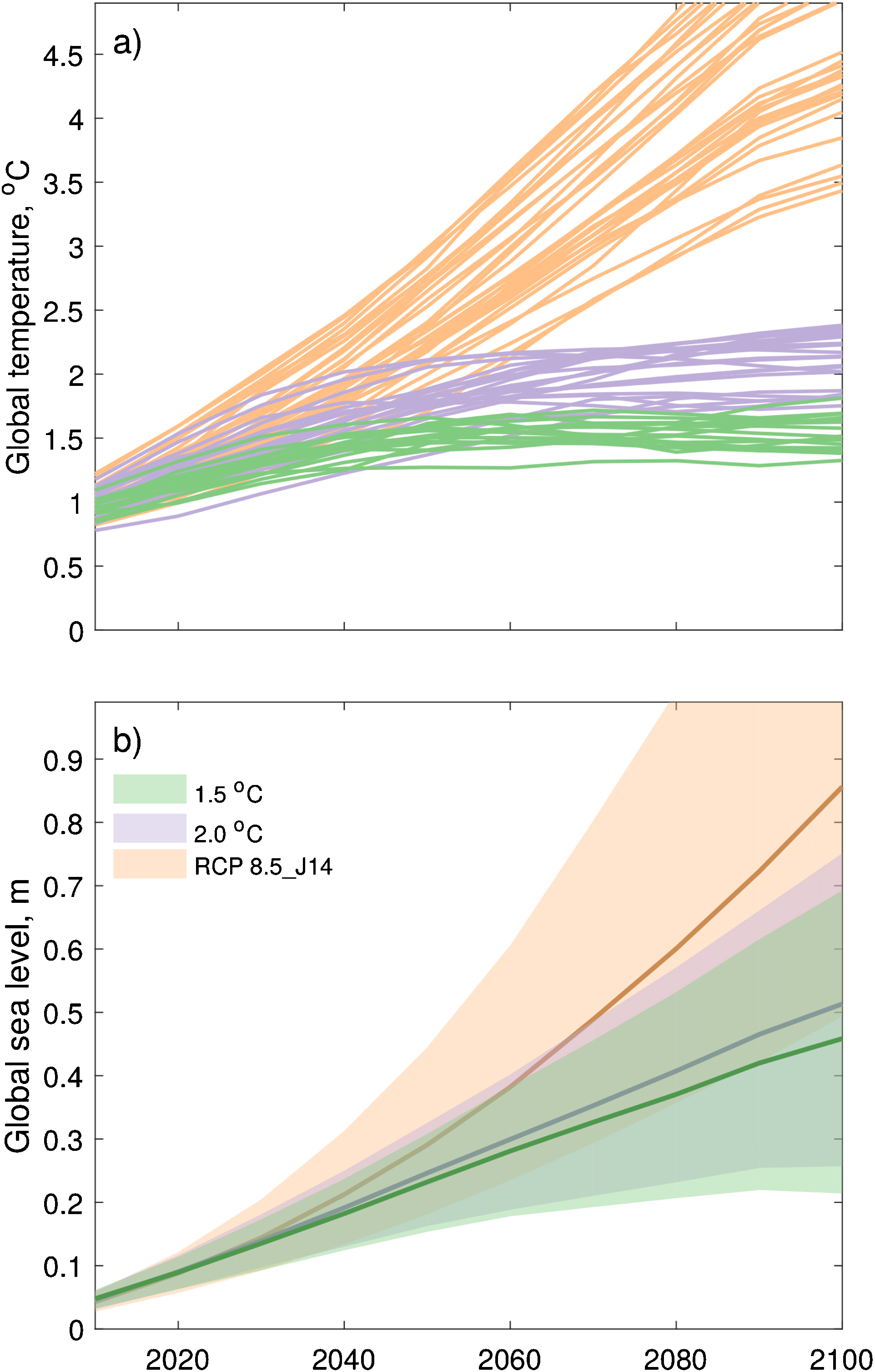 Figure 1. (a) Global temperature pathways of CMIP5 models (table S1) from RCP2.6 and RCP4.5 satisfying 1.5 and 2.0 °C by end-of-century (relative to 1986−2005, plus 0.61 °C to show relative to pre-industrial) and RCP8.5 scenario. (b) Global sea-level projections estimated using process-based approach for 1.5 °C and 2.0 °C temperature pathways and RCP8.5_J14. Line and shaded areas are median and 17th−84th percentile range respectively.