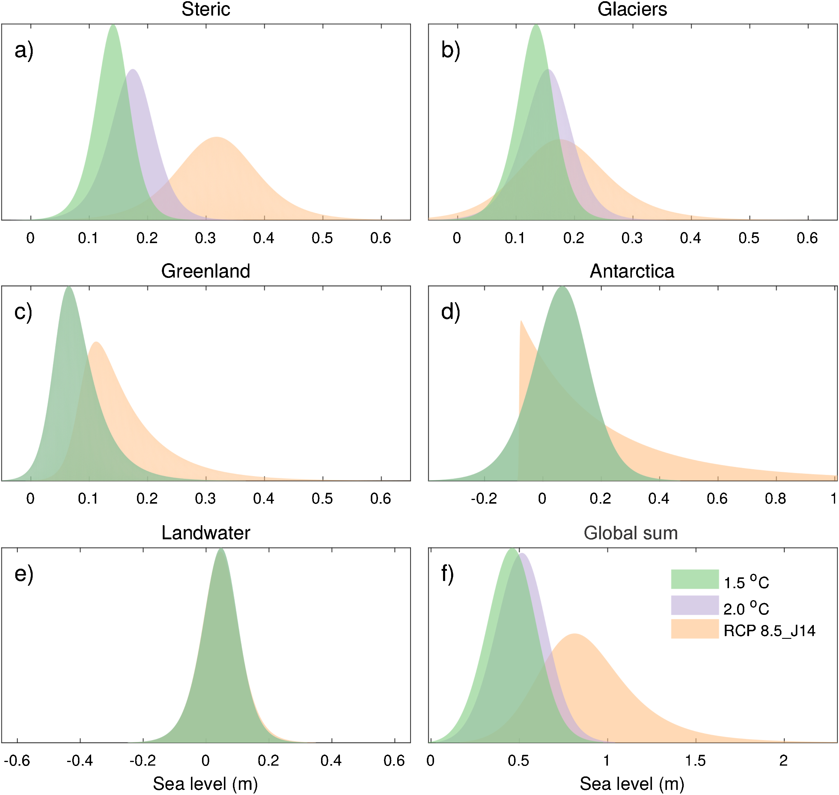 Figure 2. Probability density functions for global sea level and its components in 2100 for warming of 1.5 °C, 2 °C and RCP8.5_J14. Note that the land based water component is scenario independent.