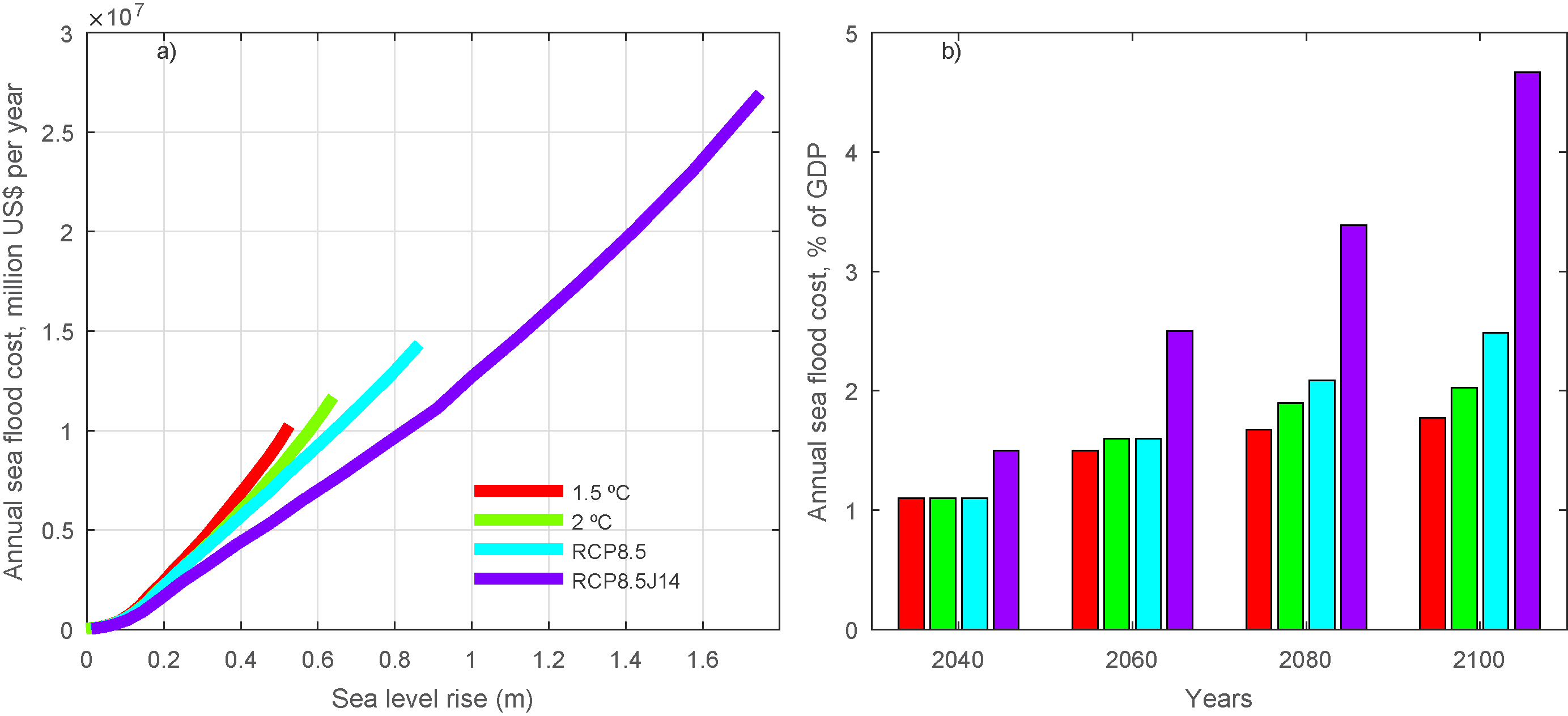 Figure 4. (a) Global annual sea flood costs (million US$ per year) without additional adaptation for 1.5 °C (red solid line), 2 °C (green), RCP8.5 (50th percentile, light blue) and RCP8.5_J14 (95th percentile, dark blue) scenarios. (b) Global annual flood costs as percentage of global GDP (table S2) without additional adaptation for sea level rise with 1.5 °C, 2 °C, RCP8.5 (50th percentile) and RCP8.5_J14 (95th percentile) at 2040, 2060, 2080 and 2100, colour on (b) panel are representing the same scenarios as at the panel (a)).