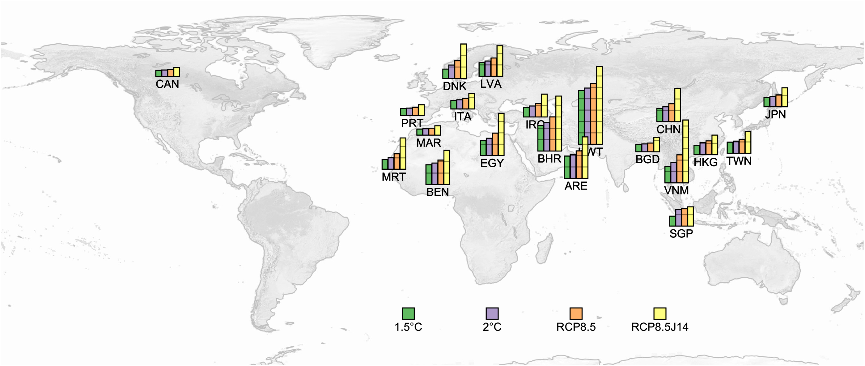 Standard image High-resolution imageFigure 5. The top 20 countries (with a GDP > US$50 billion per year, small island states are excluded, see SI for details) with the greatest annual sea flood costs using the SSP2 scenario, assuming no additional adaptation as a percentage of GDP in 2100 for the four projected sea level rise scenarios. Climate scenario marked as RCP8.5 corresponds to the median of RCP8.5_J14 (0.86 m); RCP8.5J14 corresponds to the 95th percentile of RCP8.5_J14 (1.8 m).