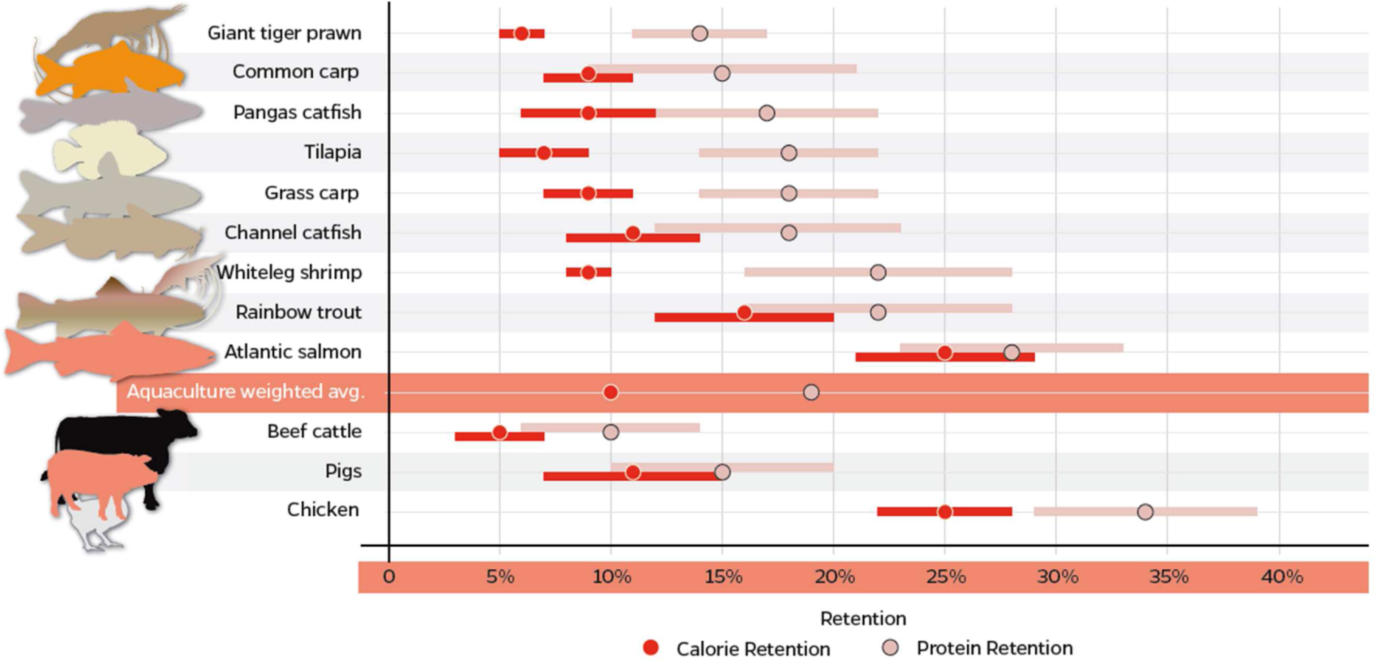 Figure 2. Protein and calorie retention for selected aquatic and terrestrial farmed animal species. Dots represent sample means and bars represent standard deviations. Higher values indicate more efficient retention.