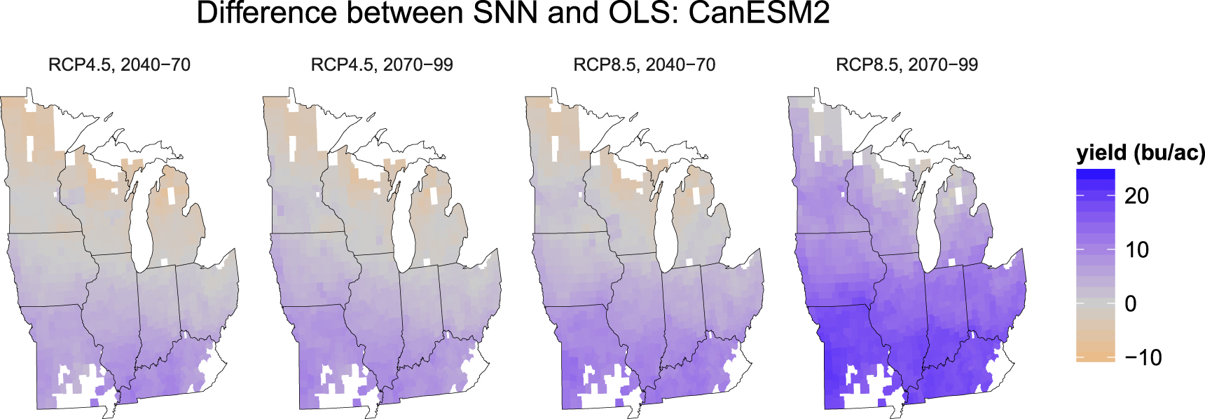 Figure 5. Spatial distribution of difference in yield projections between the semiparametric neural network, and the parametric model for a single member of our climate model ensemble (CanESM2). The OLS regression tends to be more optimistic than the SNN in the northern sections of the study region, and more pessimistic in the southern regions. See supplementary figures for output from other GCMs.