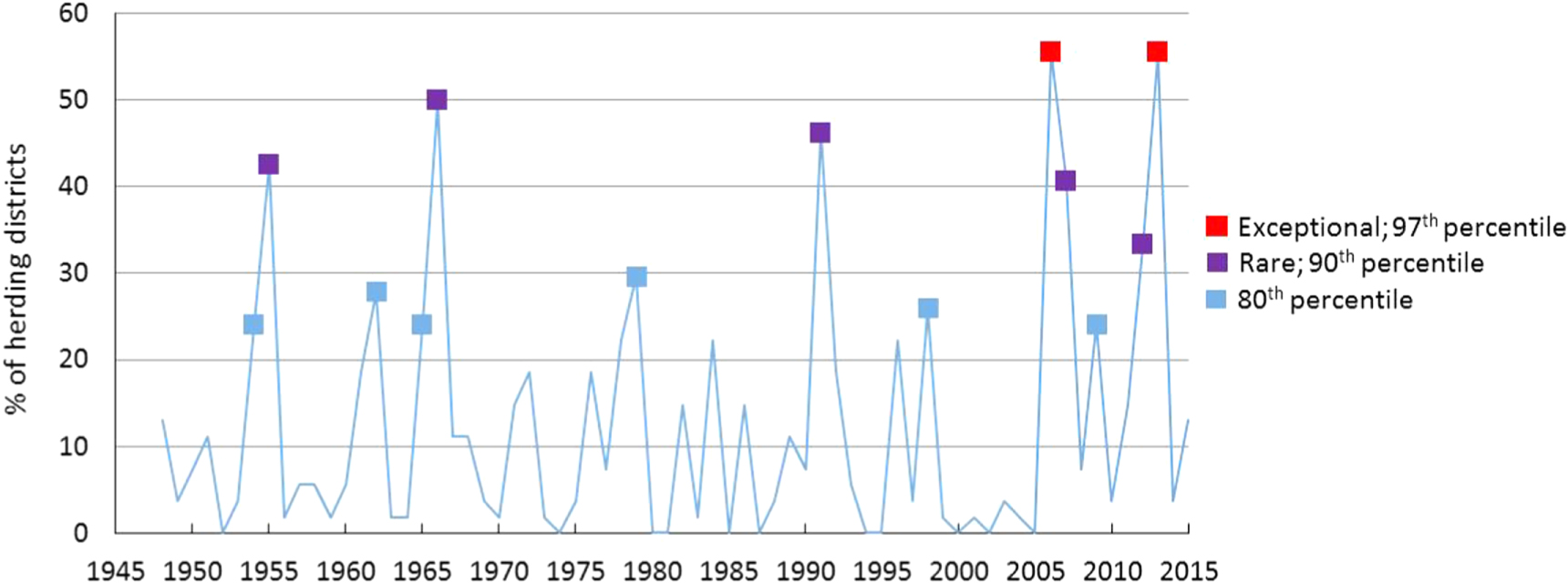 Mold formation on winter pastures is reported for 0–5 winters in each of the districts studied (figure 4). Mold formation in more than two districts (4%) can be considered a rare event (90th percentile) and in more than eight districts (15%) as an exceptional event (97th percentile). There were 35 winters when no mold formation was observed in the study area (65% of all winters). The most extensive mold formation was experienced in winters 1968–1969 (56% of the districts) and 1979–1980 (28% of the districts). Approximately 24% of all reported mold formation events (total n = 93) co-occurred with basal ice formation events at the district level. Moreover, about 5% of all reported basal ice formation events (total n = 461) co-occurred with mold formation events (within the same district).
