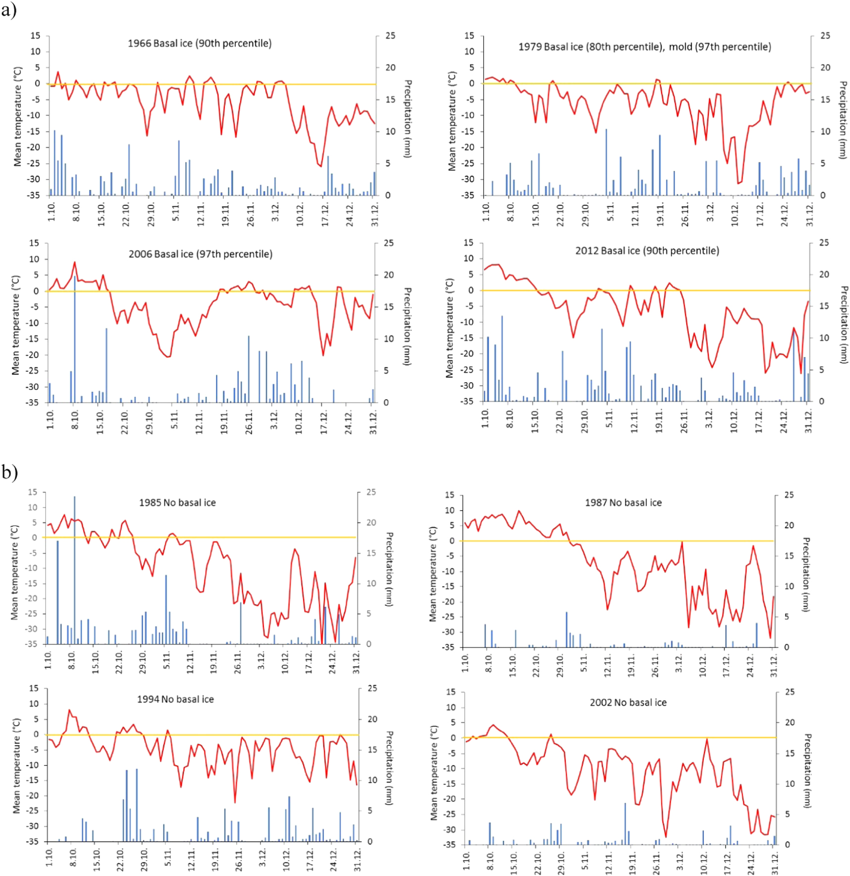 Standard image High-resolution imageFigure 6. Examples for (a) winters with extensive basal ice formation, and (b) winters with no basal ice, linked to daily mean temperature and precipitation recorded at the Sodankylä station.