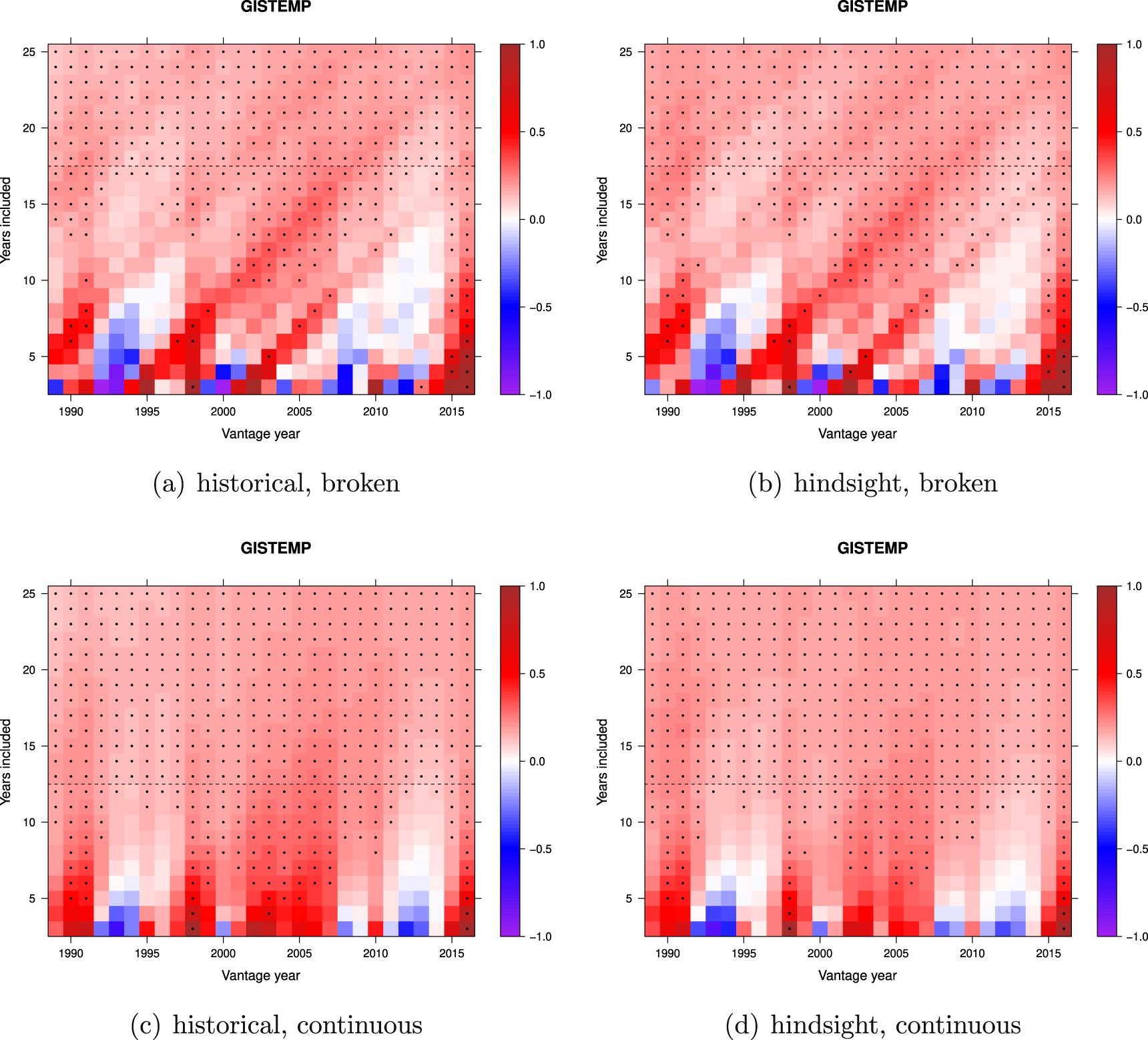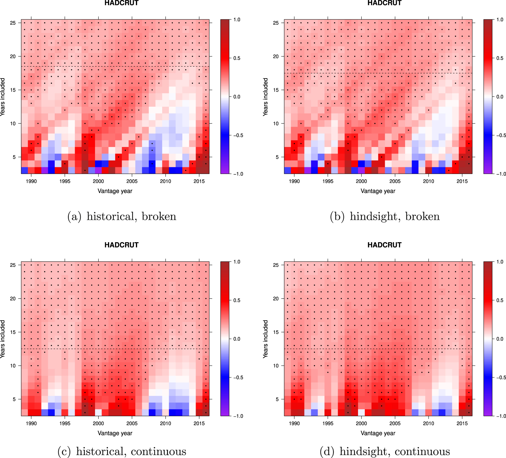 Figure 9. The plot shows the magnitude of trends (K/decade) in GISTEMP GMST (shaded) for a matrix of intervals with duration from 3 to 25 years. Trend magnitudes are capped at ±1 K for plotting. The last year of the trend interval is given by the 'vantage year' on the x-axis. The number of years in the interval is indicated on the y-axis. For example, the top right corner of the matrix corresponds to the trend of interval length 25 years, ending in 2016. The dots indicate which trends are significant (p < 0.05) in an ordinary least squares analysis of annual means. The horizontal dashed line is placed at the interval duration above which trends from all vantage years in the plot are significant. The top left panel (a) is for historical data (the versions of the GISTEMP data that were current for the given vantage year) and broken trends. The top right panel (b) computes all trends from the version of GISTEMP available in 2017 (hindsight) and uses broken trends. The bottom left panel (c) uses historical GISTEMP data and continuous trends. The bottom right panel uses hindsight (2017) GISTEMP data and ensures that all trends are continuous.