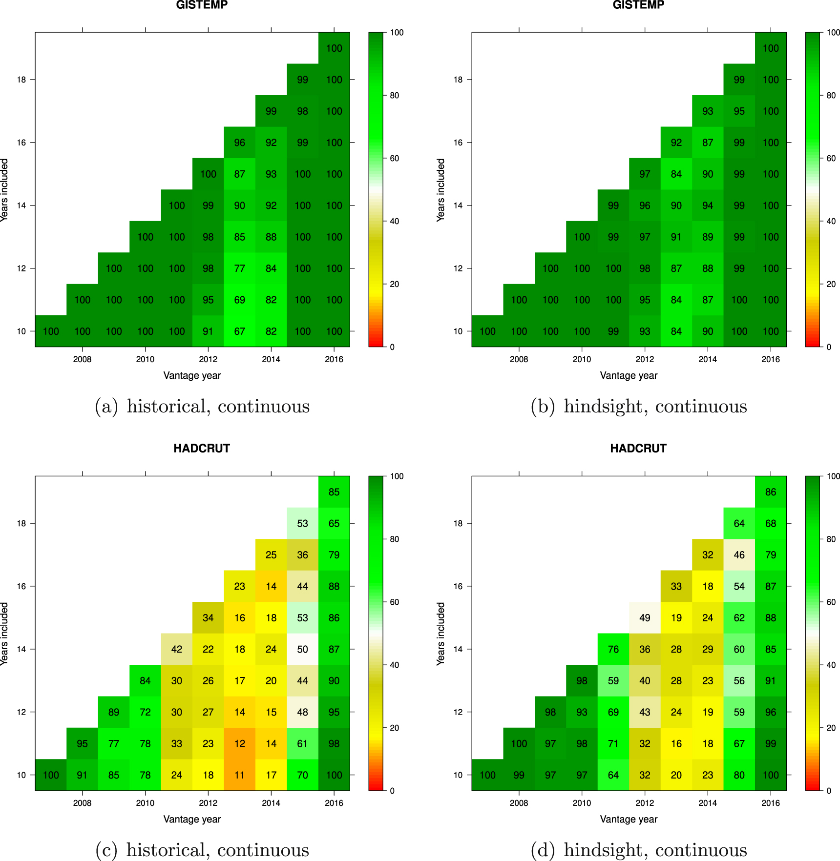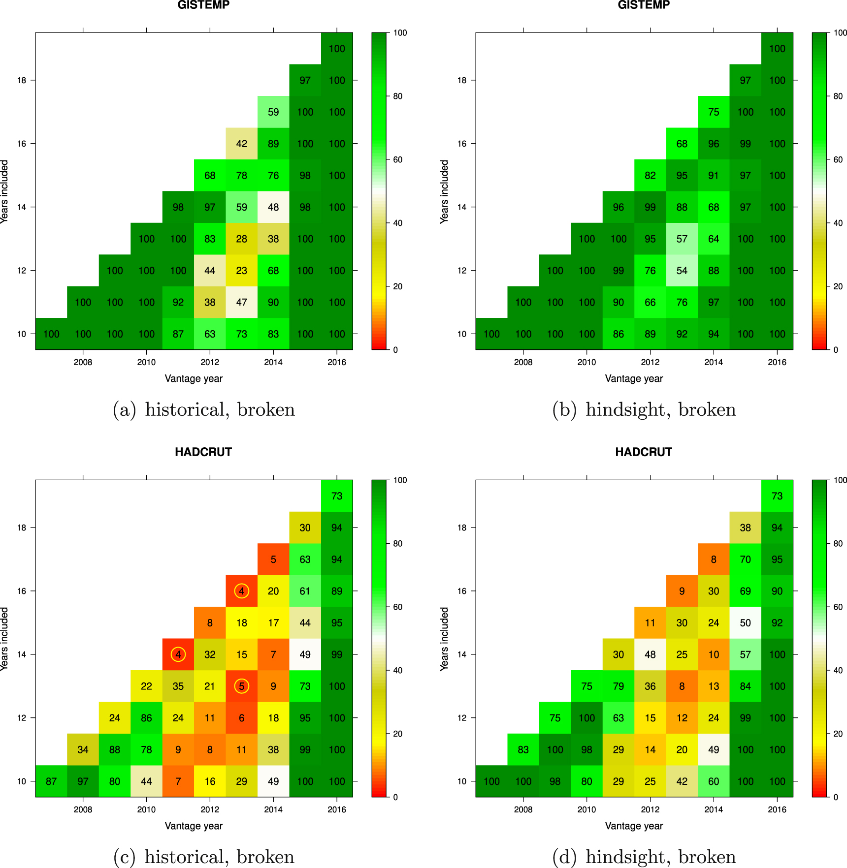 Figure 11. Multiple tests of a matrix of pause-interval trends. Each element of the matrix corresponds to a trend-interval spanning the last year of the interval (vantage year) back through the number of years listed on the y-axis. For example, the top right element of the matrix is for the 19 year trend-interval ending in 2016. Each of these trends is compared with a population of trends. The population is generated by taking the baseline-interval from the change point in the dataset signifying the modern warming period to the start of each trend-interval. The residuals to a best fit from this baseline-interval are then used to generate 1000 Monte Carlo realisations of a series from the beginning of the baseline-interval to the end of the trend-interval. The magnitude of the trend-interval is then assessed against a population of all intervals of the same length that occur any time in the Monte Carlo realisations. The shading denotes the percentage of realisations that contain an interval of a lower trend magnitude than the pause-interval trend tested. The numbers in the squares are the actual percentages. Where a yellow circle is present it denotes that fewer than 5% of the realisations in the Monte Carlo sample contain a lower magnitude trend interval than the tested pause-interval trend. For broken trends for GISTEMP using (a) historical data and (b) hindsight data, and for HadCRUT using (c) historical data, and (d) hindsight data.