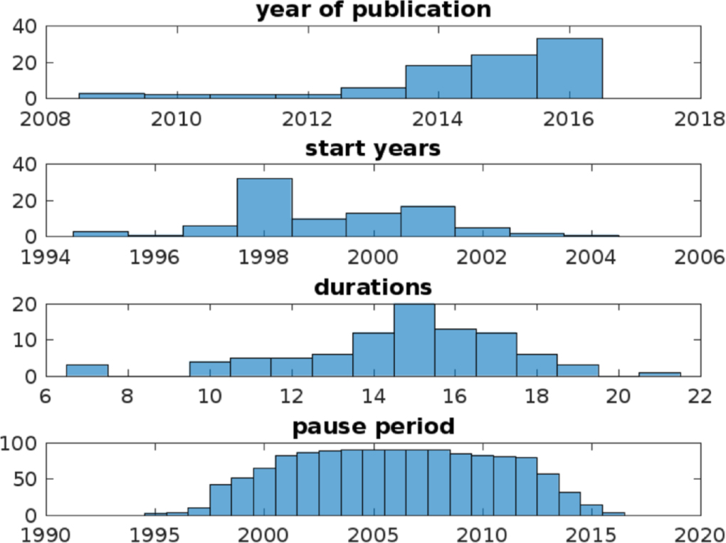 There is no single or dominant definition of the 'pause' in the literature (Lewandowsky et al 2015b). Many papers are not explicit about the period used to assess the pause or the criteria used to reach the conclusion that there is a pause. The distribution of start dates from the pause-papers (set of 90) for the 'pause' is shown in figure 1(b). These span a range from 1995 to 2004 illustrating the lack of consensus on this issue. Further, there is usually little or no statistical justification offered for choice of the start-year. This is a critical issue which we return to in section 3.4. Similarly, the durations presumed for pauses in the pause-papers span a range from about 10 to 20 years with a median of 15 years (figure 1(c)). The number of times a given year falls into the period defined as a pause across all the pause-papers is shown by the histogram in figure 1(d). The frequency profile of the histogram reveals a 'pause-period' in the literature spanning roughly 1998–2015.