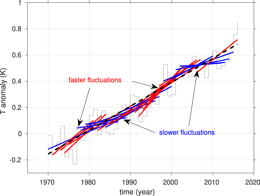Figure 2. Time series of annual GMST anomaly from Cowtan and Way (stair plot). The black dashed line is a linear fit over the period. The thin red and blue lines are linear 11-year trend lines sliding over the period. These lines are red/blue when the slope of the 11-year fit is greater/less than the slope of the longer-term dash line. The choice of interval length here (11 years) is arbitrary, but all interval lengths used in the pause-papers will exhibit periods of faster and slower than average trend.