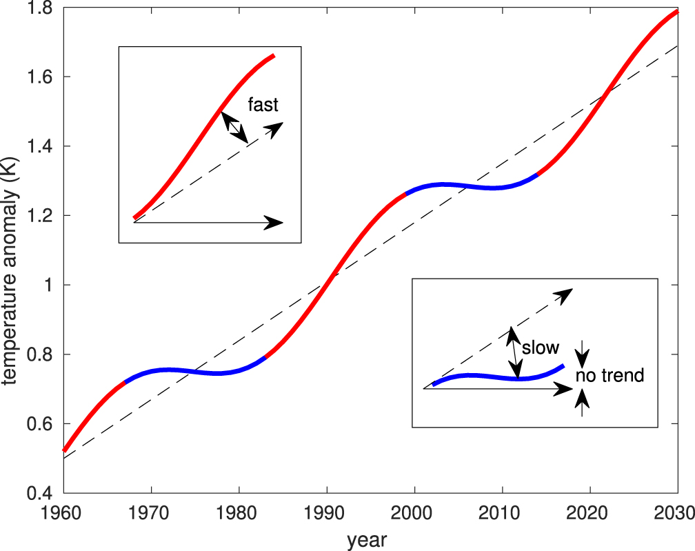 Figure 3. Idealised schematic of a smoothed global mean surface temperature series (blue/red line). The series is a linear trend plus sinusoidal variation to mimic multidecadal fluctuations. The dashed line is the linear fit component. The series is coloured red/blue when the local gradient is steeper/shallower than the linear fit. The inset boxes show a red segment where the slope is compared to the long-term linear slope, and a blue segment where the slope is compared to either the long term linear slope or to zero slope.