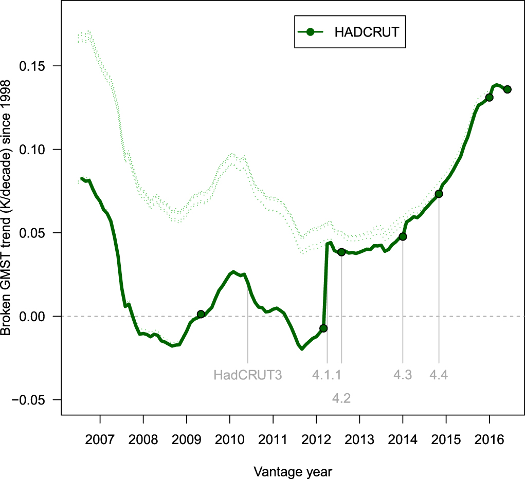 Figure 5. Historically conditioned trends. The solid line is the best fit least squares trend in HadCRUT data from a start year of 1998 to end year (vantage year) as shown on the x-axis. The thick line corresponds to the version of HadCRUT current at the current vantage year, with the vertical grey lines indicating which versions applied. The thin dotted lines provide retrospective trends back to trend end year of 2007 to show what the trends would have been if the current version of the data had been available earlier to compute the trend. The green dots indicate when an update to the dataset was available. Only some of the updates constitute new versions. The trends are incremented from monthly data which results in some fine scale variation in the trends.
