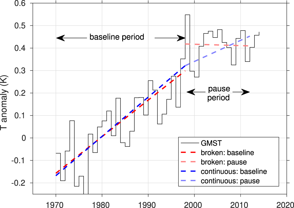 Alternatively, one can ask whether the evidence depended on the statistical methods and assumptions used to test for a 'pause'. Suppose for example that the use of continuous trends and selection bias testing had been standard at the time the pause-research was first carried out. In that case there would have been no statistical evidence for a pause, even using HadCRUT3 GMST data, and the issue would presumably not have gained any currency in the research community. Thus, the use of inappropriate statistical tests also contributed to the perception of a 'pause'. That also raises issues for the research community about the need to formulate definitions of new phenomena in terms of clear, quantifiable metrics, and in avoiding the common pitfalls in trend analysis (Miller 2013). Some recommendations along these lines for addressing future (inevitable) fluctuations in GMST trend might include: