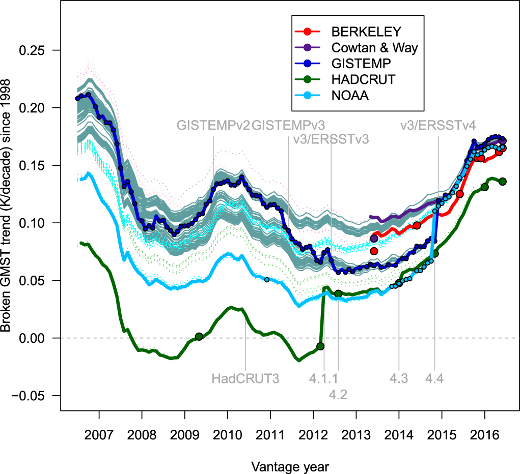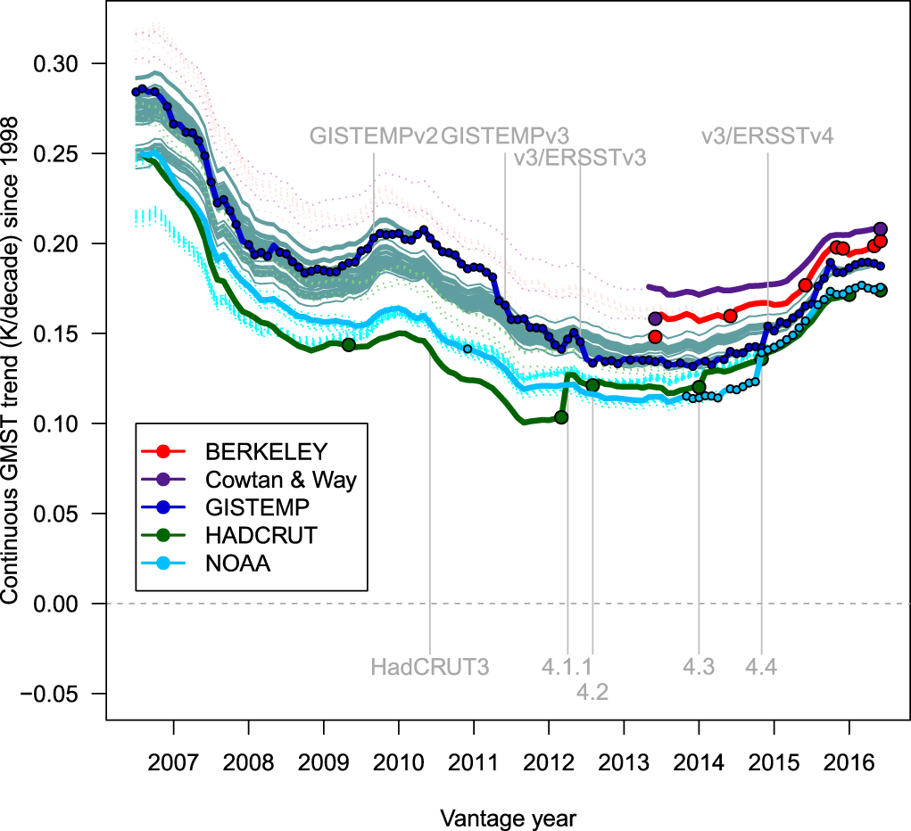 The various GMST datasets were updated during the pause-research period, resulting in different views of short-term trends for different versions of these datasets (section 3.2). An illustration of the effect of these changes on short-term trends is shown in figure 7, which plots the magnitude of the trend since 1998 in each of the five datasets. Noticeable jumps in the trend value (solid lines) occur for HadCRUT, NOAA, and GISTEMP as they undergo the bias reductions to SST described in section 3.1.